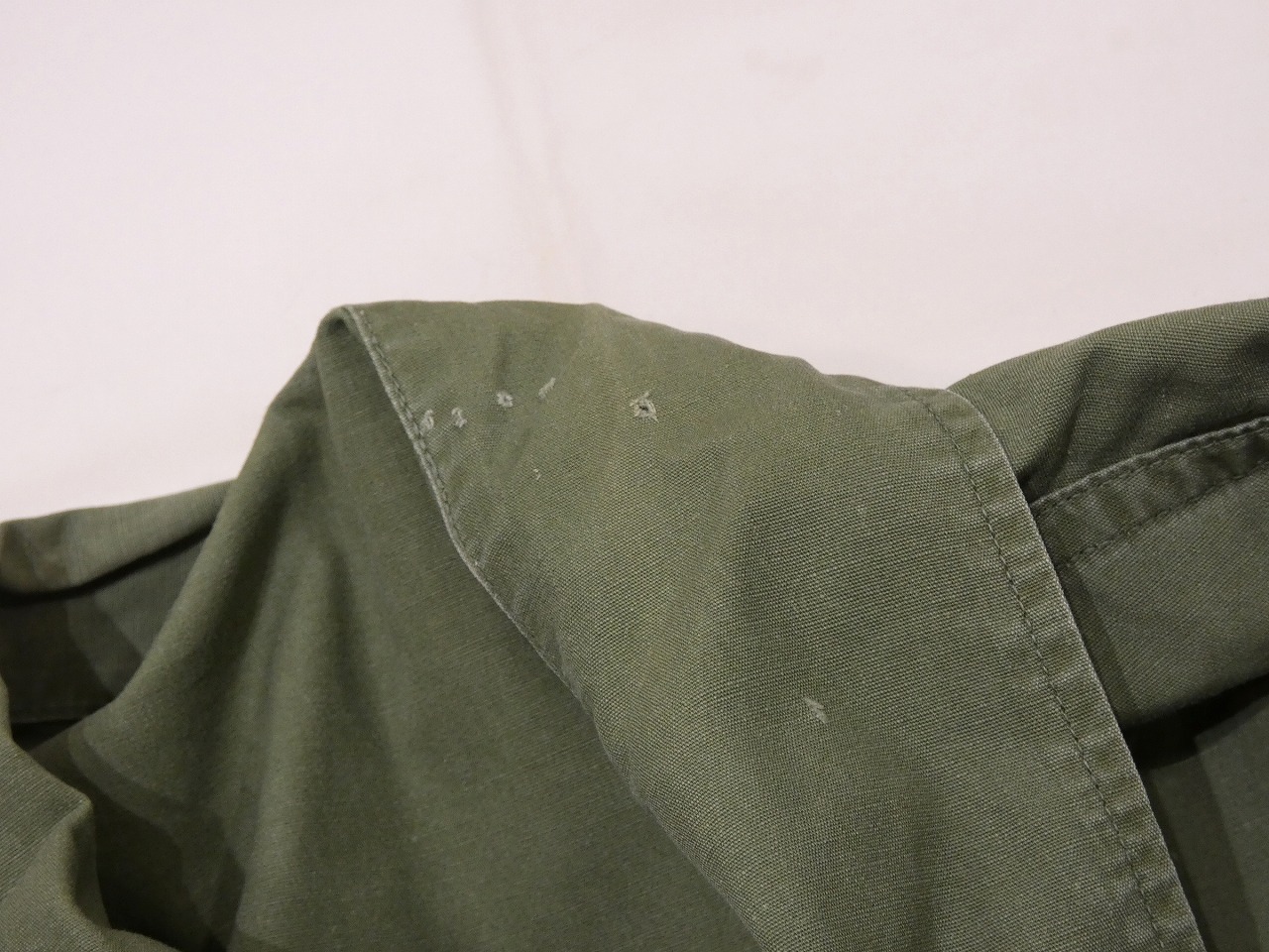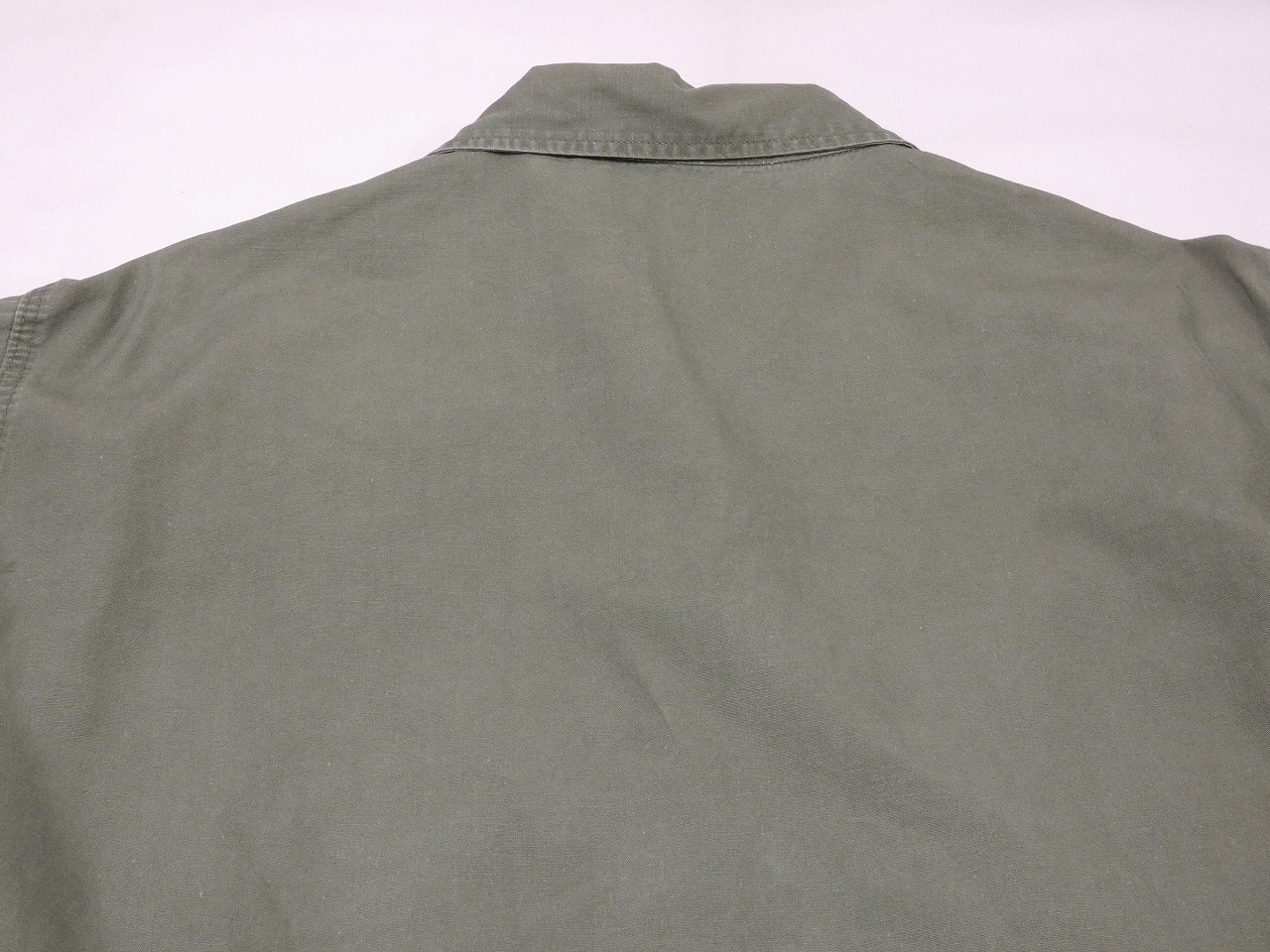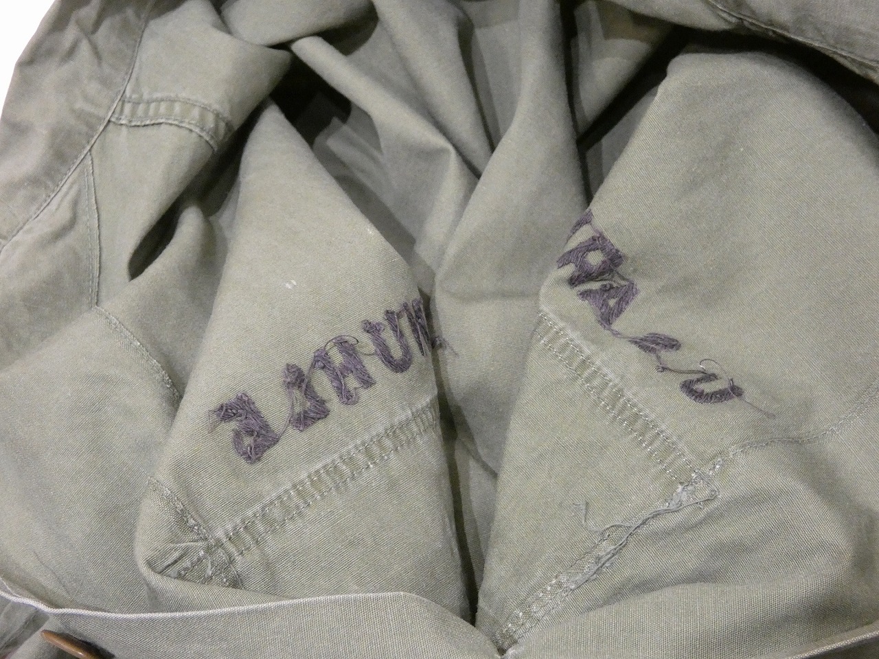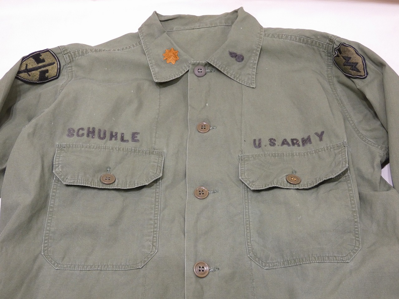 PXやサープラスショップで売られていたシビリアンタイプのユーティリティシャツで、ブランドタグは付かなく、消えていますが恐らくは、内側裾の方にスタンプが入るLOUIS ARONOFF Coブランドの物かと思います。同デザインのポプリンユーティリティは、TROOPERやBVDなども納入していました。DEAD STOCKなども良いですが、こちらは実際に使用されていた物でパッチや刺繍が入っています。MAJOR(中佐)の方が使用されていた様で、胸のUS ARMYや所有者ネーム、襟の階級章などは全てハンド刺繍で縫われている所も面白いポイントです。感じ的にはベトジャンの刺繍の様です。肩の部隊パッチはそれぞれベトナム軍事援助司令部と第25歩師団のパッチになります。今まで沢山のユーティリティシャツを見てきましたが、直接刺繍されているのはとても珍しいと思います。通称3rdと呼ばれるデザインでカフスの付かない筒状の袖は、シャツはもちろん薄手のジャケットの様にも使える万能アイテムです。サイズもゆったり着れるサイズ感ですので、探されていた方は是非、ご検討下さい。