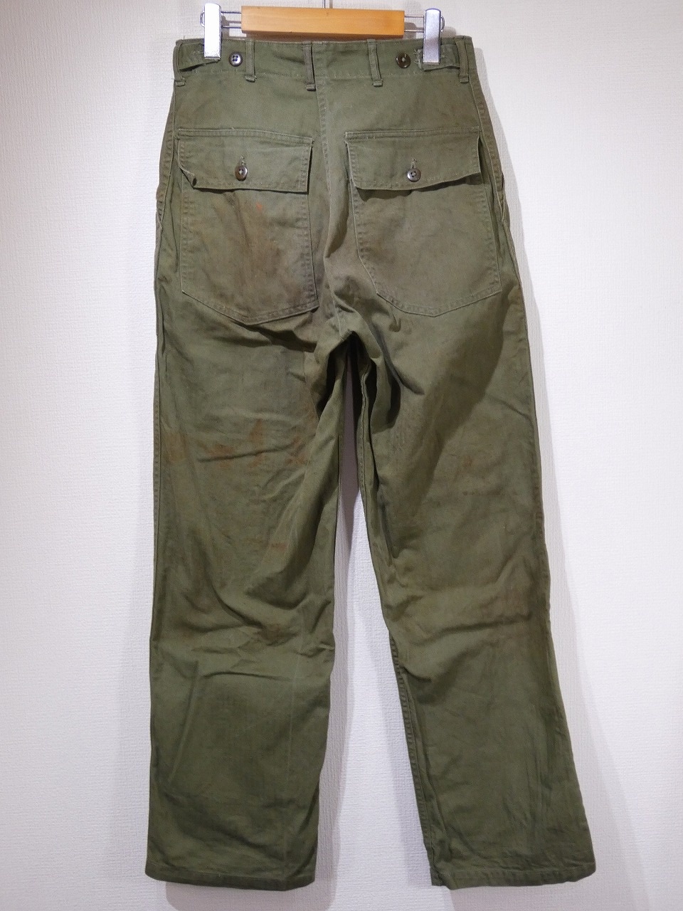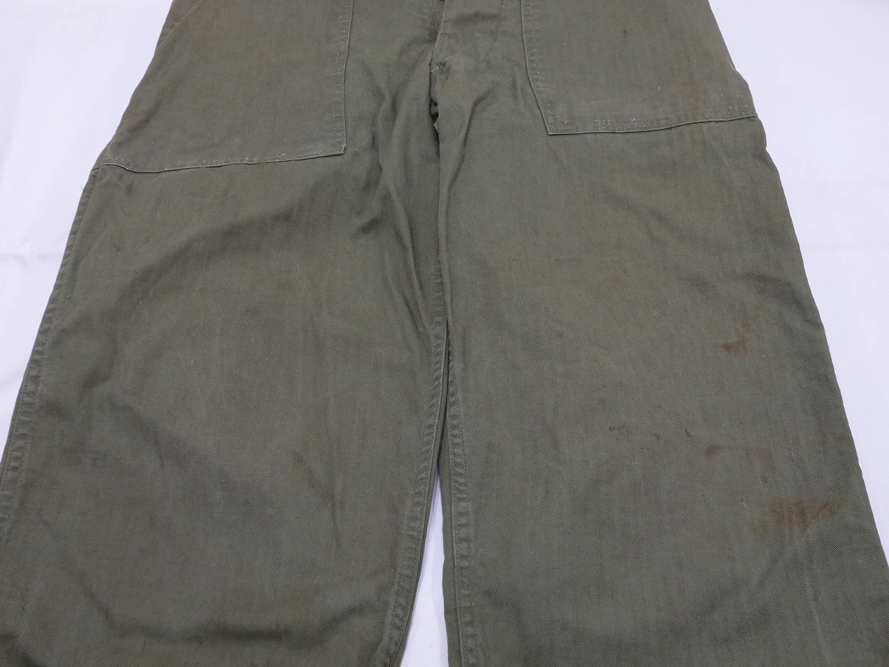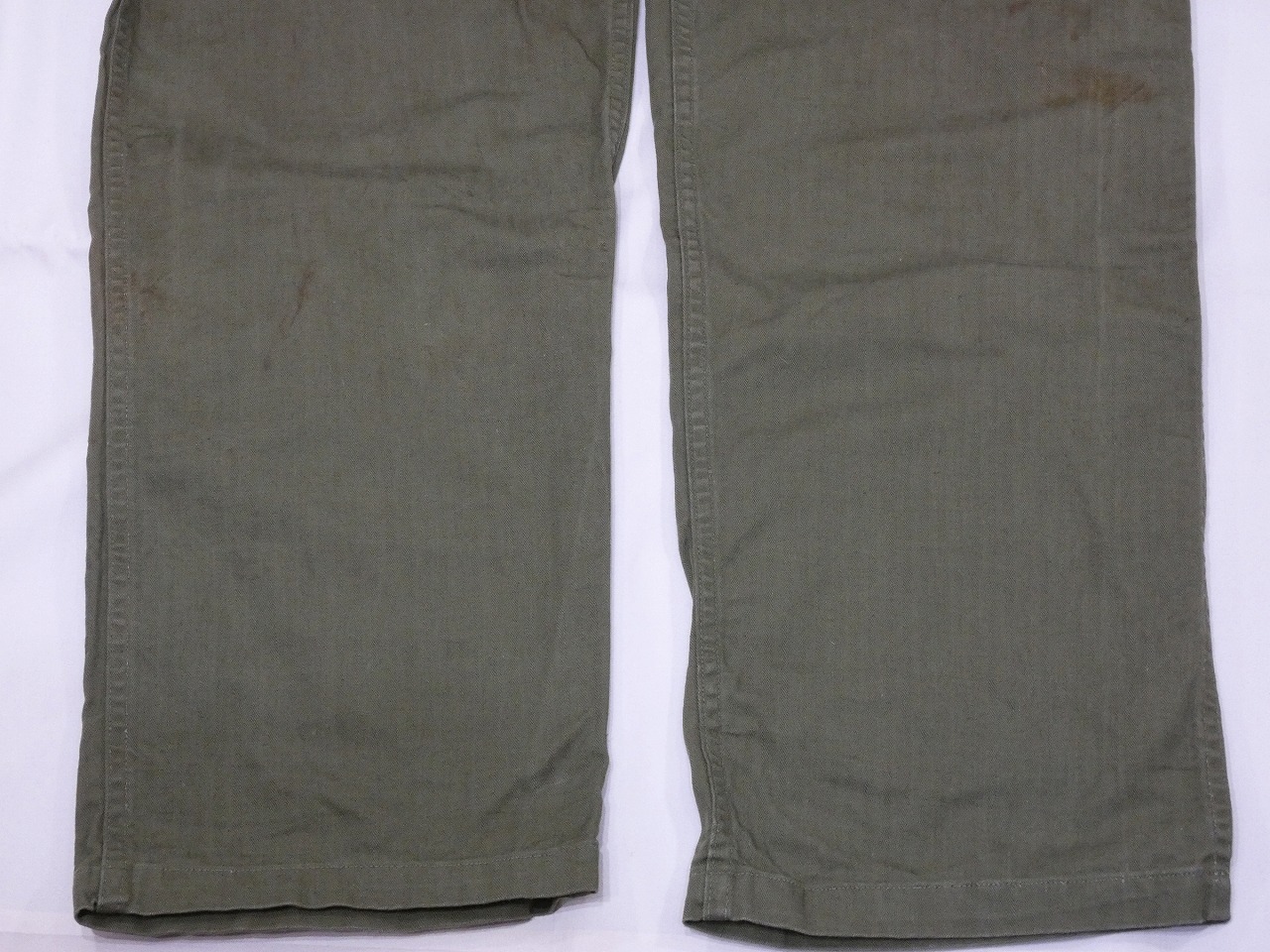 素材は50年代初期まで採用されたOD-7 ヘリンボーンツイルで、一般的にベイカーパンツと呼ばれているモデルの最初期型です。この後のコットンサテンの初期と同じ、サイドアジャスタストラップ、ブラウンの平ボタン、スタンプ刻印が特徴的なディテールになります。通年通してお探しの方の多いパンツですが、HBT生地の物は本当に出てきません。シルエットも程よい太さで、色々なコーディネートに合う万能な1本です。ややヨゴレは目立ちますが、この様な雰囲気の物がお好きな方も多いいと思います。サイズの合う方は是非、ご検討下さい。