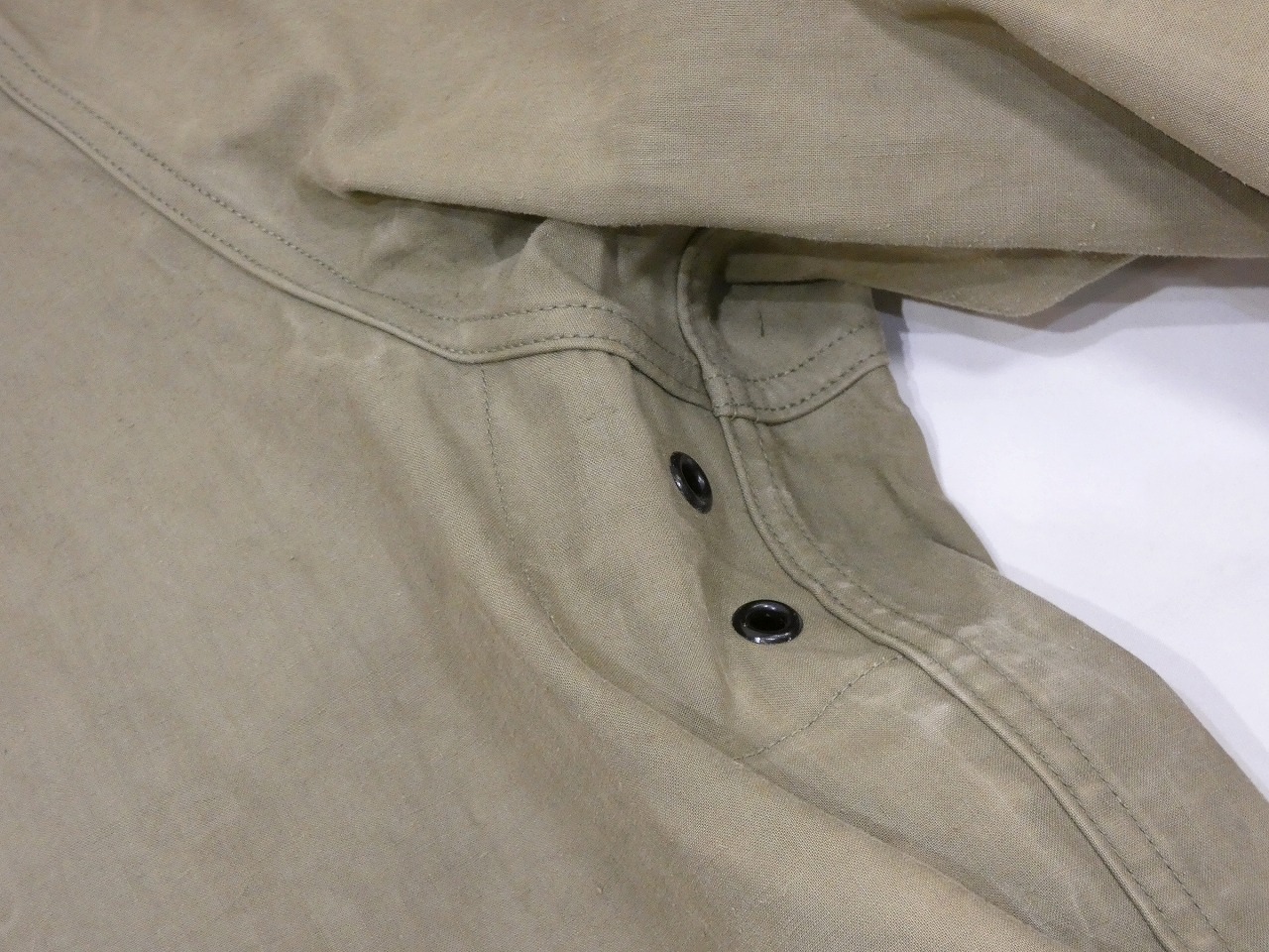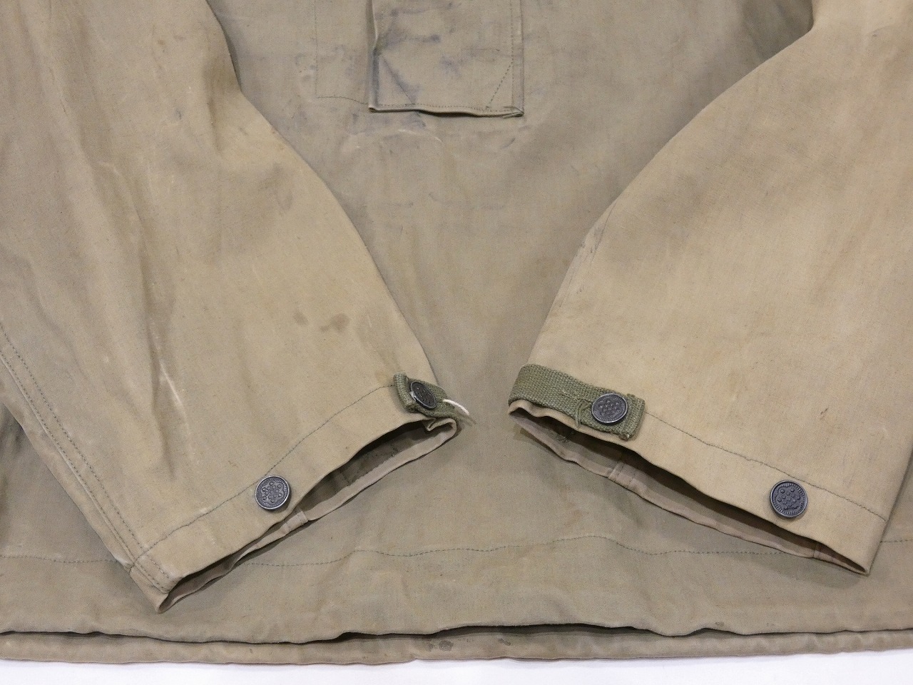 良くネット上ではUS NAVY(USN)のN-2レインパーカとして掲載されている物を多く見かけますが、こちらは実際はアメリカ陸軍用のウエットウエザーパーカになります。正式名称がUSNの方はJACKET RAIN PARKA N-2に対し、US ARMYはPARKA WET WEATHERになります。初期タイプは、フロントの4つのフックは留めは一緒ですが、袖がUSNはセットインに対し、US ARMYはラグランスリーブで、袖先がスナップ留めに対しアジャスター留め、フードのドローコードハトメの位置も違います。タグもUSNは横長のNXsから始まるコントラクトに対し、US ARMYは縦長のタグで、製造年やコントラクター、Specification Noなどが入ります。こちらは残念ながらタグは欠損しておりますが、以前デッドストックの物で確認しているので間違いありません。背中にやや目立つフェードは見られますが、リアルさがあり雰囲気満点です。お探しだった方は是非、ご検討下さい。