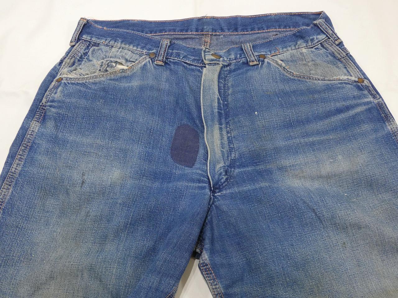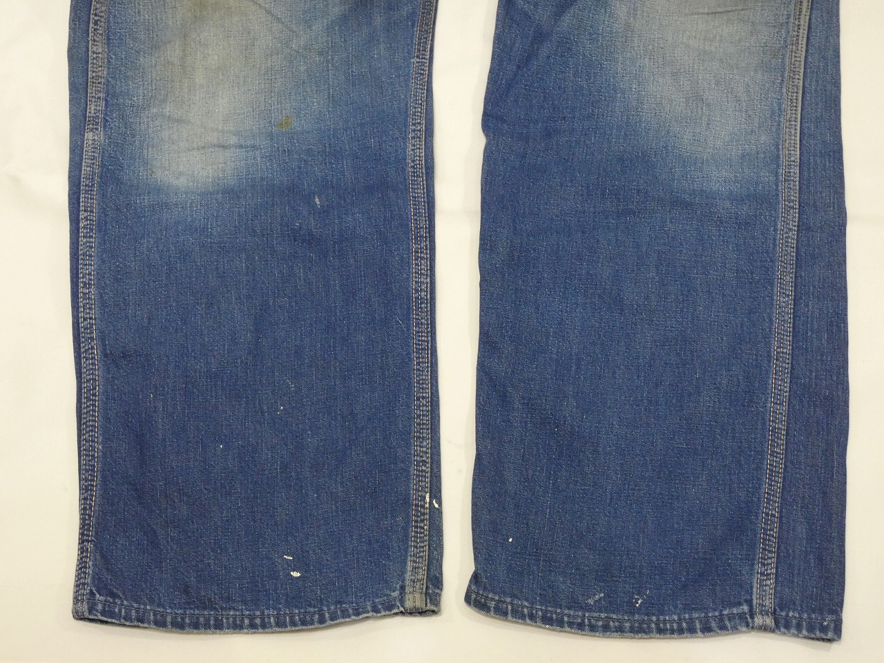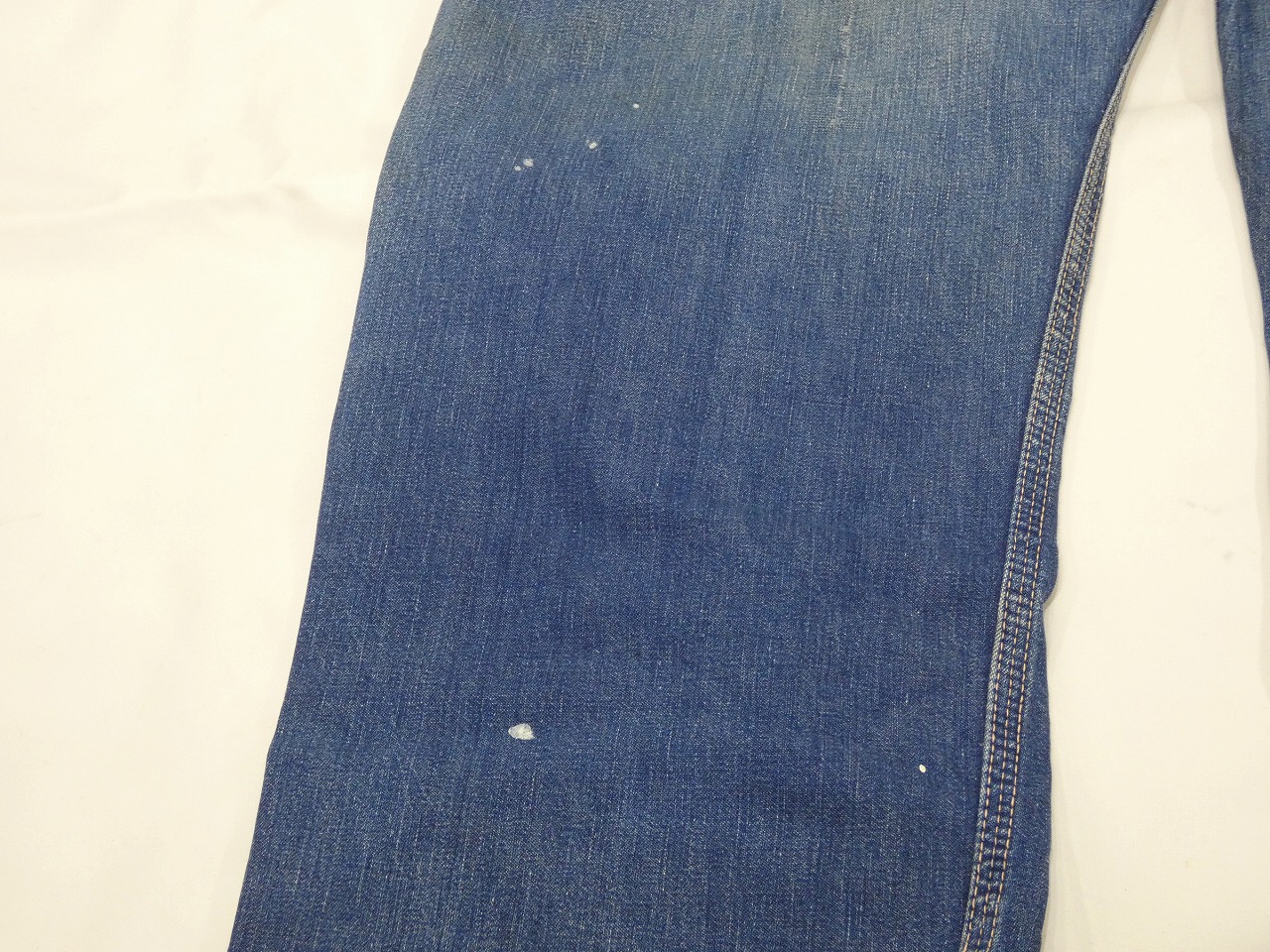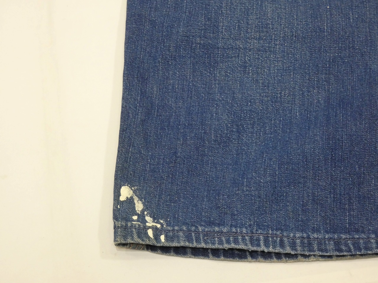 コンディションはやや使用感があり、全体的に色落ち、ジッパー交換、ポケット付近にダメージ、右腿や右ポケットスレーキにデニムを当てたリペア、腿に薄いシミやヨゴレ、所々にステッチ飛び、裾の方ン白いペンキ跡なども見られますが、現状着用に問題はなく、とても雰囲気の良い1本かと思います。