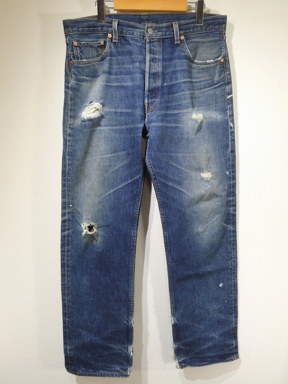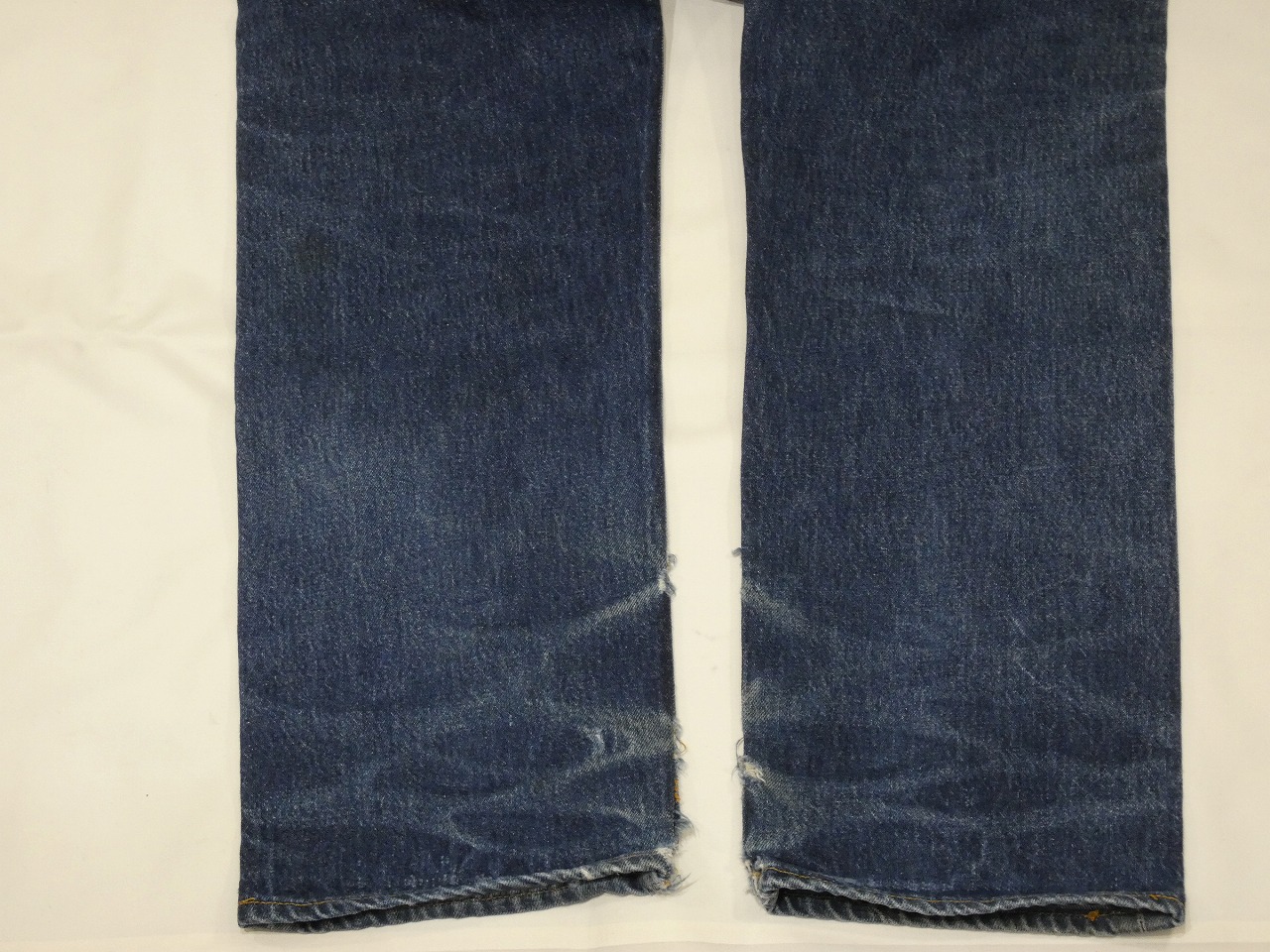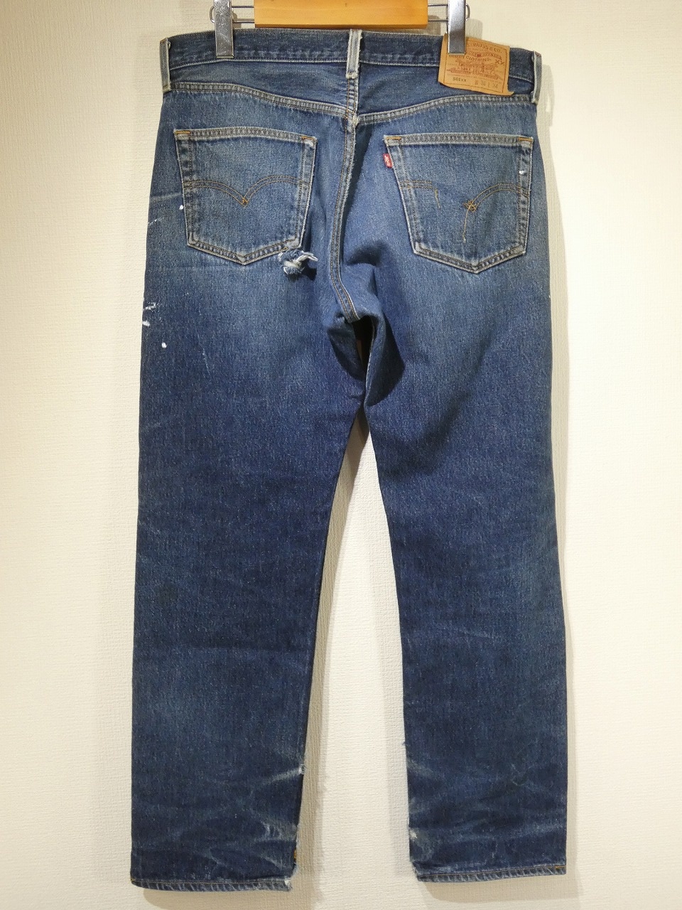 コンディションはやや使用感があり、モモやマタ、スソの方やヒップなどにダメージ、所々に少しペンキ飛び、アーキュエイトステッチ解れなども見られますが、レギュラー501とは思えない強烈なヒゲ落ちをしています。