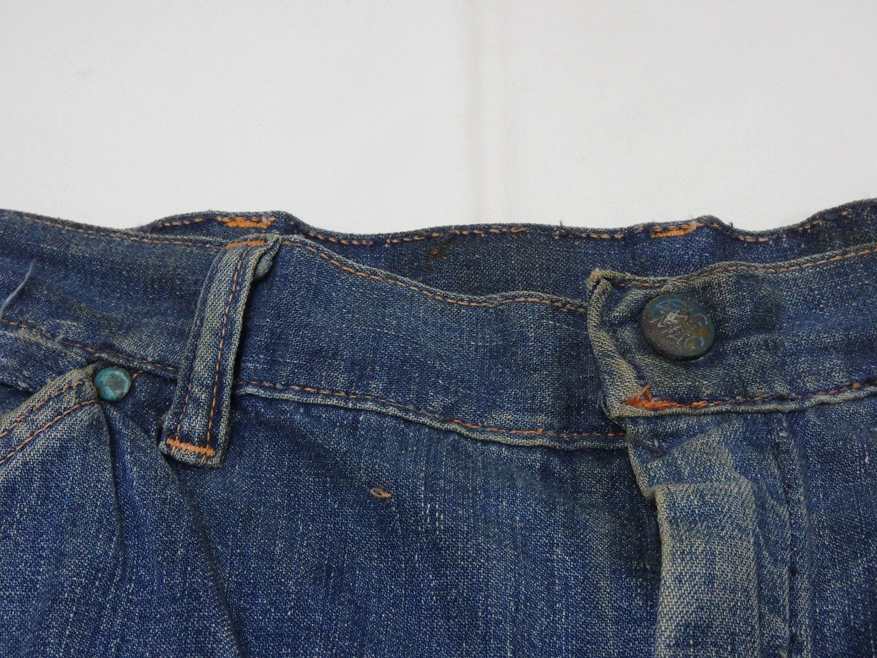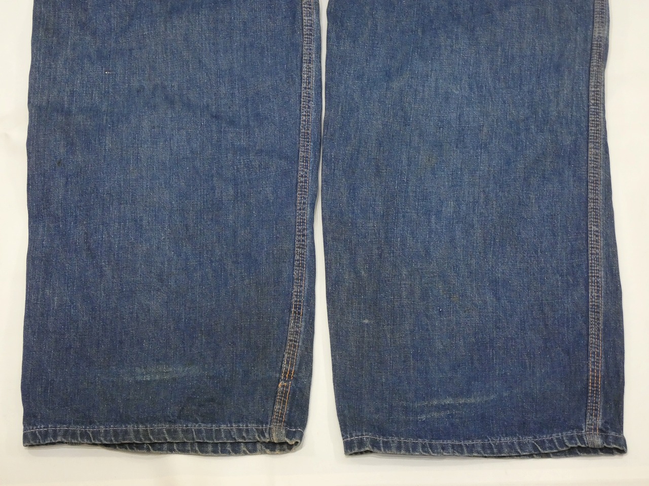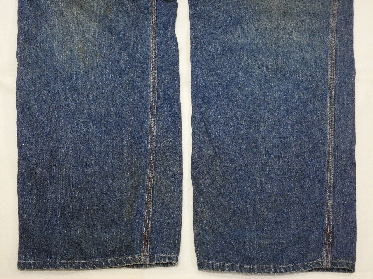 コンディションは、ボタンやリベットにサビ、ジッパー交換、ポケットにスレキズ、フロント合わせ付近に小キズ、所々にオイルやサビヨゴレ、ヒップポケットなどにステッチ切れ、裾の方に折り返しによるスレなどが見られますが、酷いダメージなども無くとても良い雰囲気の1本です。