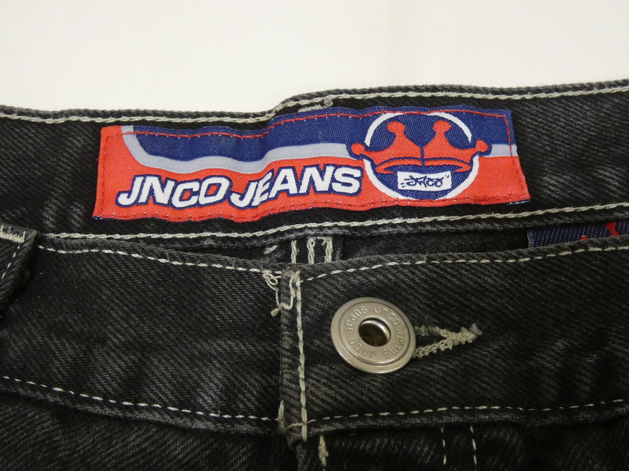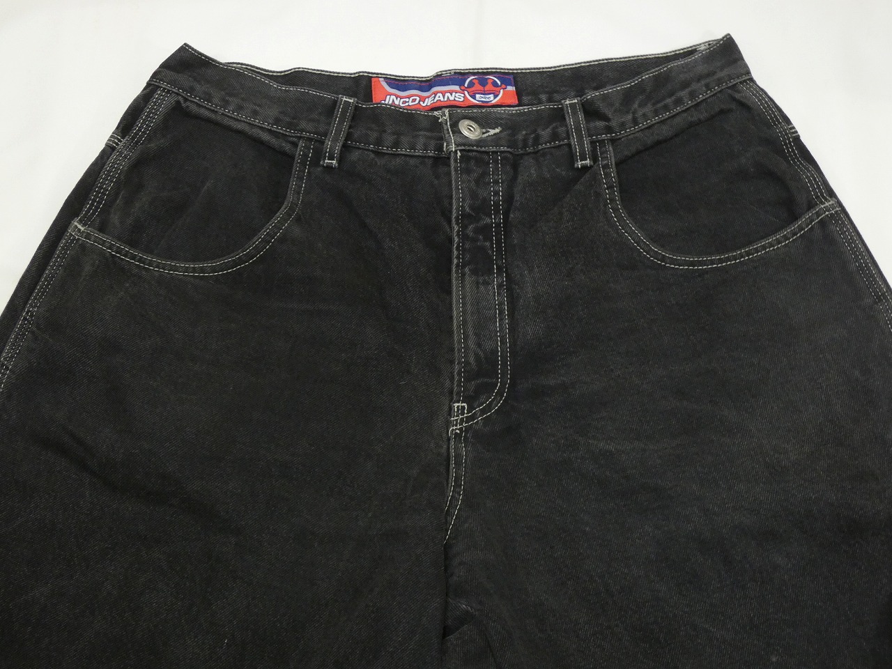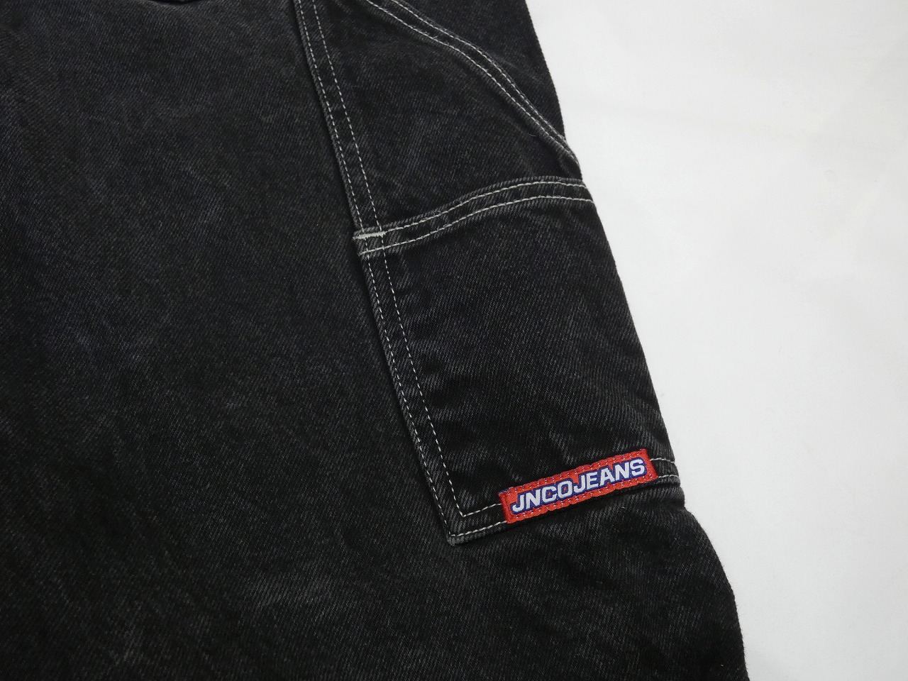 JNCO JEANSは1985年にカリフォルニアで創業したストリートブランドで、JNCOは(Judge None Choice One)の略語です。そんなこちらは、お探しの方も多いオールド ジンコで、LOOSE FITやBAGGYなどに比べてさらに太いドカン ストレート デザインになります。合わせやすいブラックというのも嬉しいポイントです。Y2Kスタイルやスケーター、HIP HOPにレイブ系ファッションに相性抜群です。ウエストはやや大きめですが絞って穿くとさらに太さが強調されるかと思います。お探しだった方は是非、ご検討下さい。