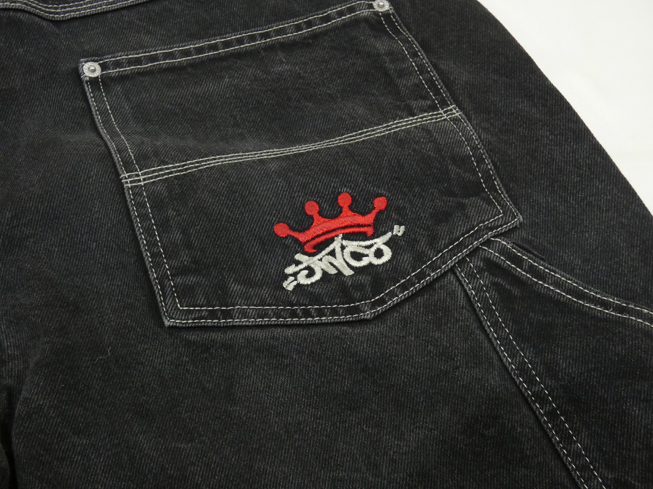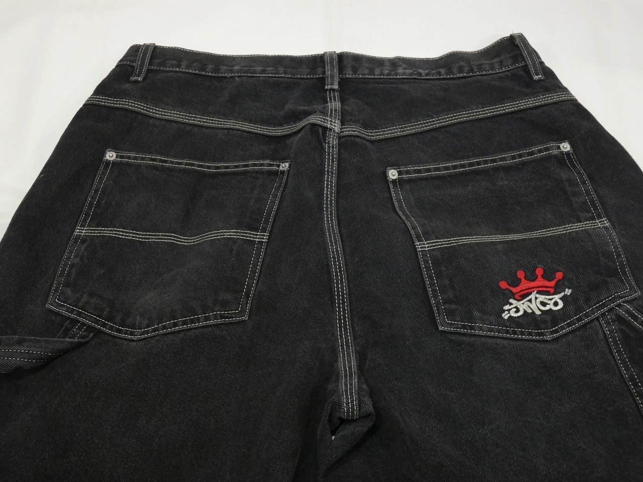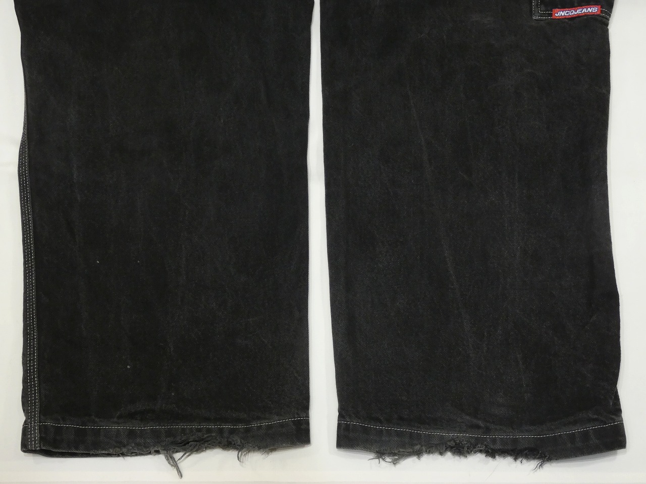 JNCO JEANSは1985年にカリフォルニアで創業したストリートブランドで、JNCOは(Judge None Choice One)の略語です。そんなこちらは、お探しの方も多いオールド ジンコで、LOOSE FITやBAGGYなどに比べてさらに太いドカン ストレート デザインになります。合わせやすいブラックというのも嬉しいポイントです。Y2Kスタイルやスケーター、HIP HOPにレイブ系ファッションに相性抜群です。ウエストはやや大きめですが絞って穿くとさらに太さが強調されるかと思います。お探しだった方は是非、ご検討下さい。