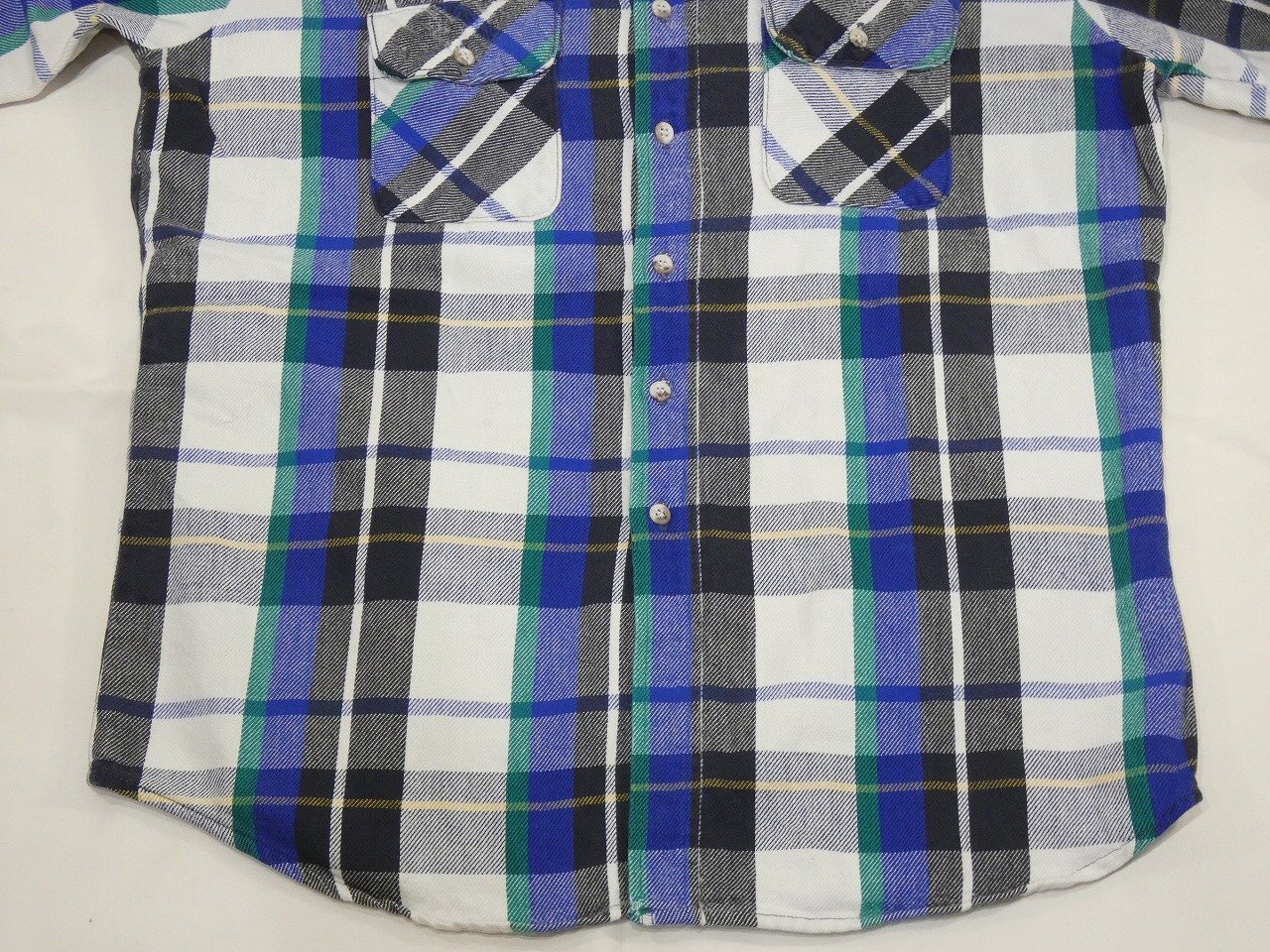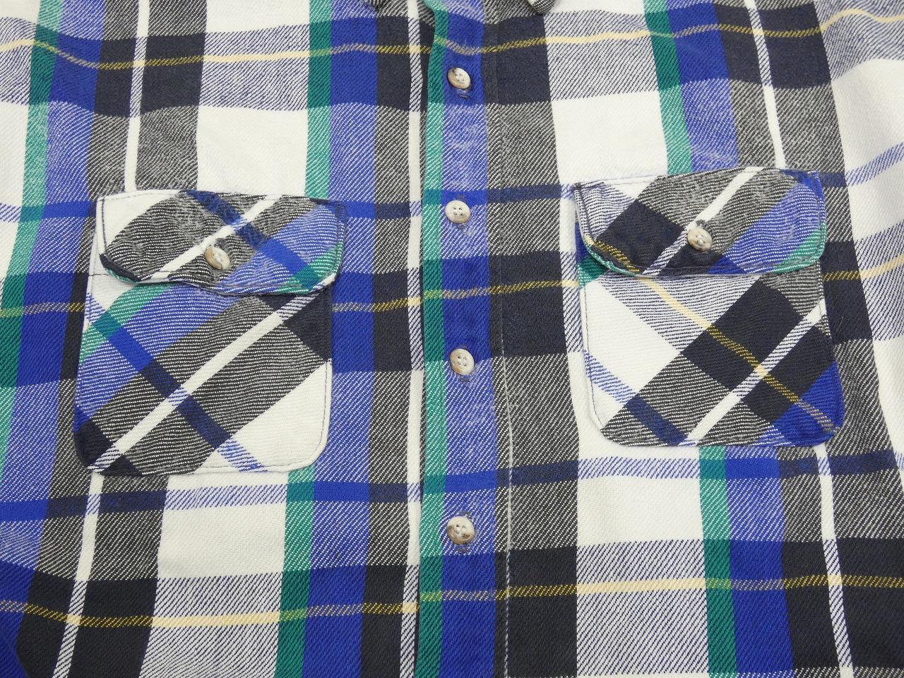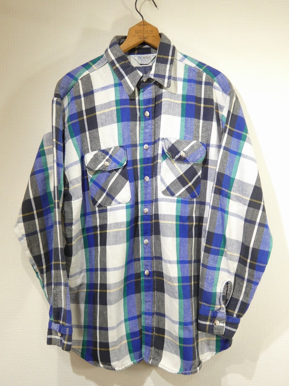FIVE BROTHERは1890年ニューヨーク州で創業の老舗ワークブランドで、現在は日本のメーカーがアパレル権を取得しており、日本でも人気のブランドになっています。そんなこちらは、ホワイトベースにブラックとブルー、グリーンにイエローが入った良いカラーリングの1枚です。意外に探すと少ないUSA製の大き目サイズになります。縮みや状態の悪い物が多いヘビーネルですので、お探しだった方は是非、ご検討下さい。