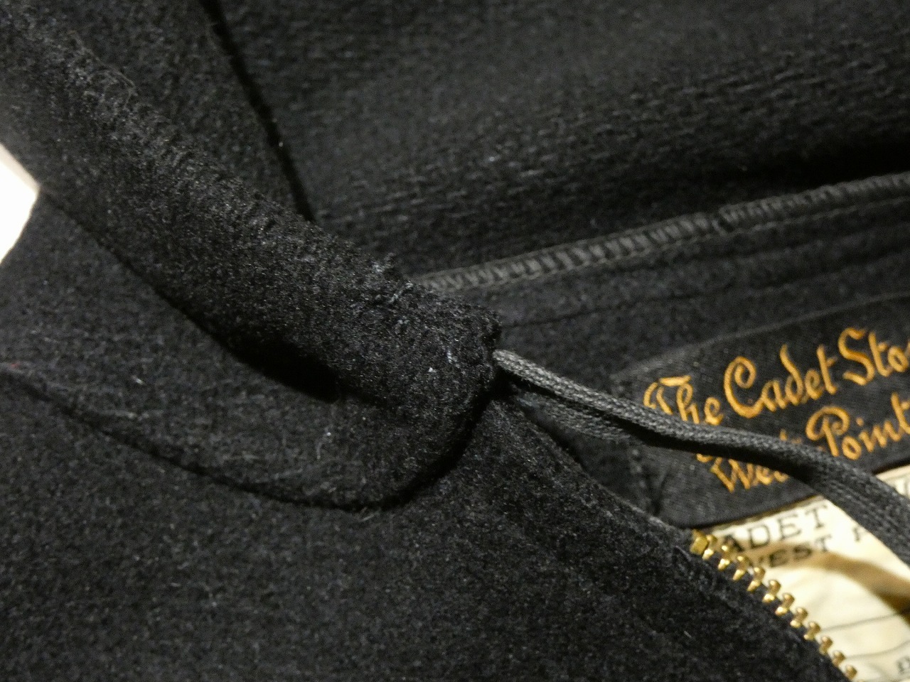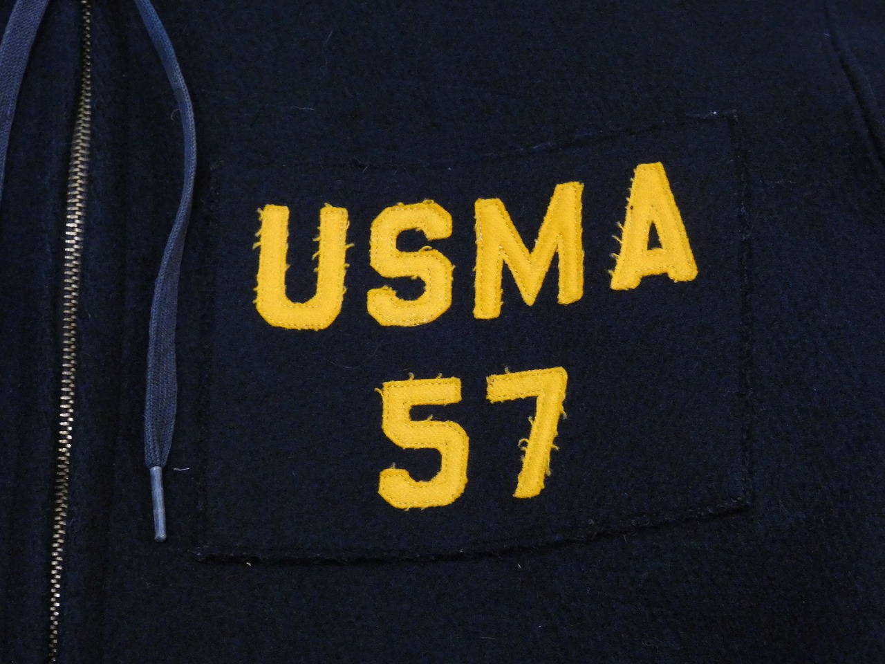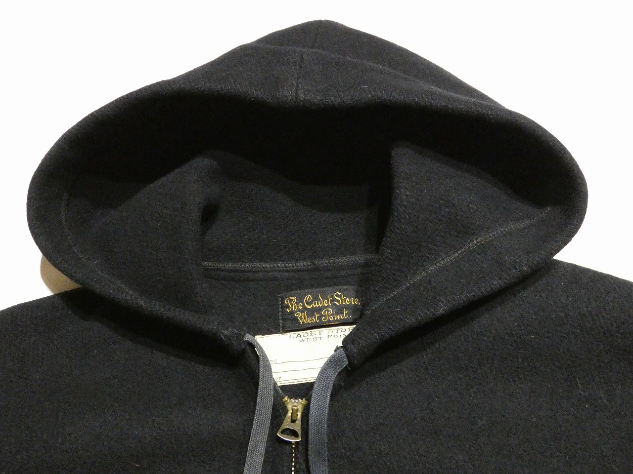 タグにThe Cadet Store West Pointと記載がある通り、WEST POINTにあるアメリカ陸軍士官学校の生徒が着用していたジャケットになります。年代によりデザインの変更がありますが、フーデッド ジャケットでは初期のデザインになります。ブラックメルトンボディーにフードと袖リブが付いたシンプルなデザインが特徴です。胸にはUSMA 57のフェルトパッチが付いています。こちらは卒業年度を表しており、ボディー自体ももう少し古い年代の物が使われています。年々状態の良い物は見かけなくなくなってきました。お探しだった方は是非、ご検討ください。