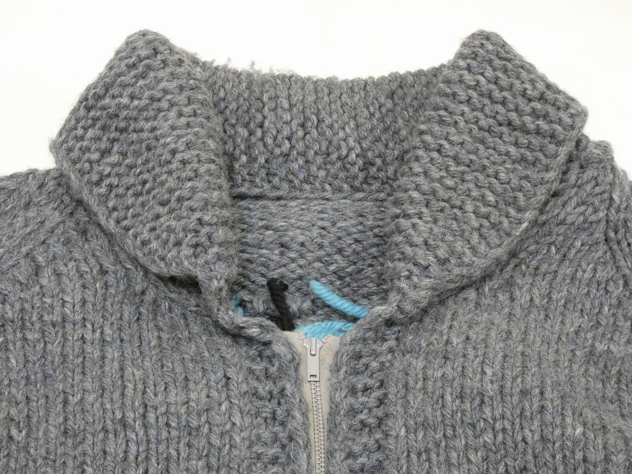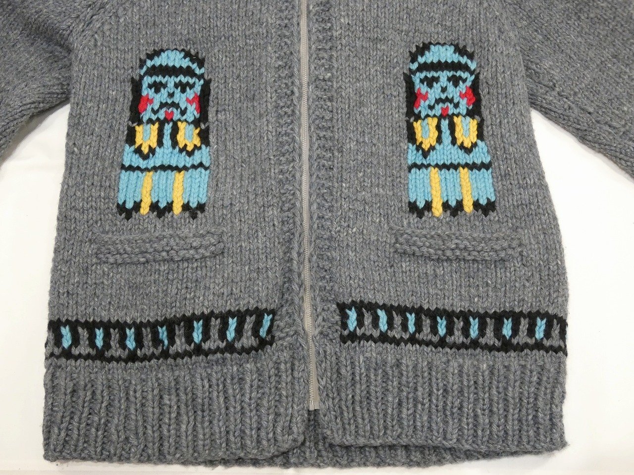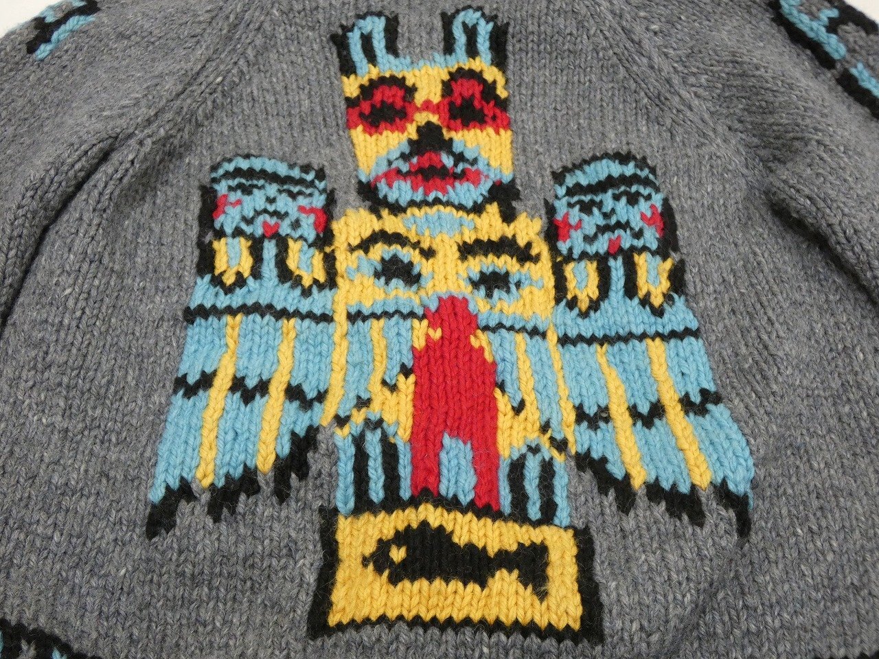 トーテムポール柄は何パターンかありますが初見のデザインの1着です。グレーベースのボディーに、背中には毒々しく発色の良いトーテムポール、両袖にはALASKAの文字、フロントポケット上には可愛らしいトーテムポールも編み込まれてた豪華なカウチンです。ウルフ柄など人気があり高騰していますが、こちらのカウチンも個人的にスペシャルな1着かと思います。本当に見たことないデザインですので、ご興味ある方は是非、ご検討下さい。