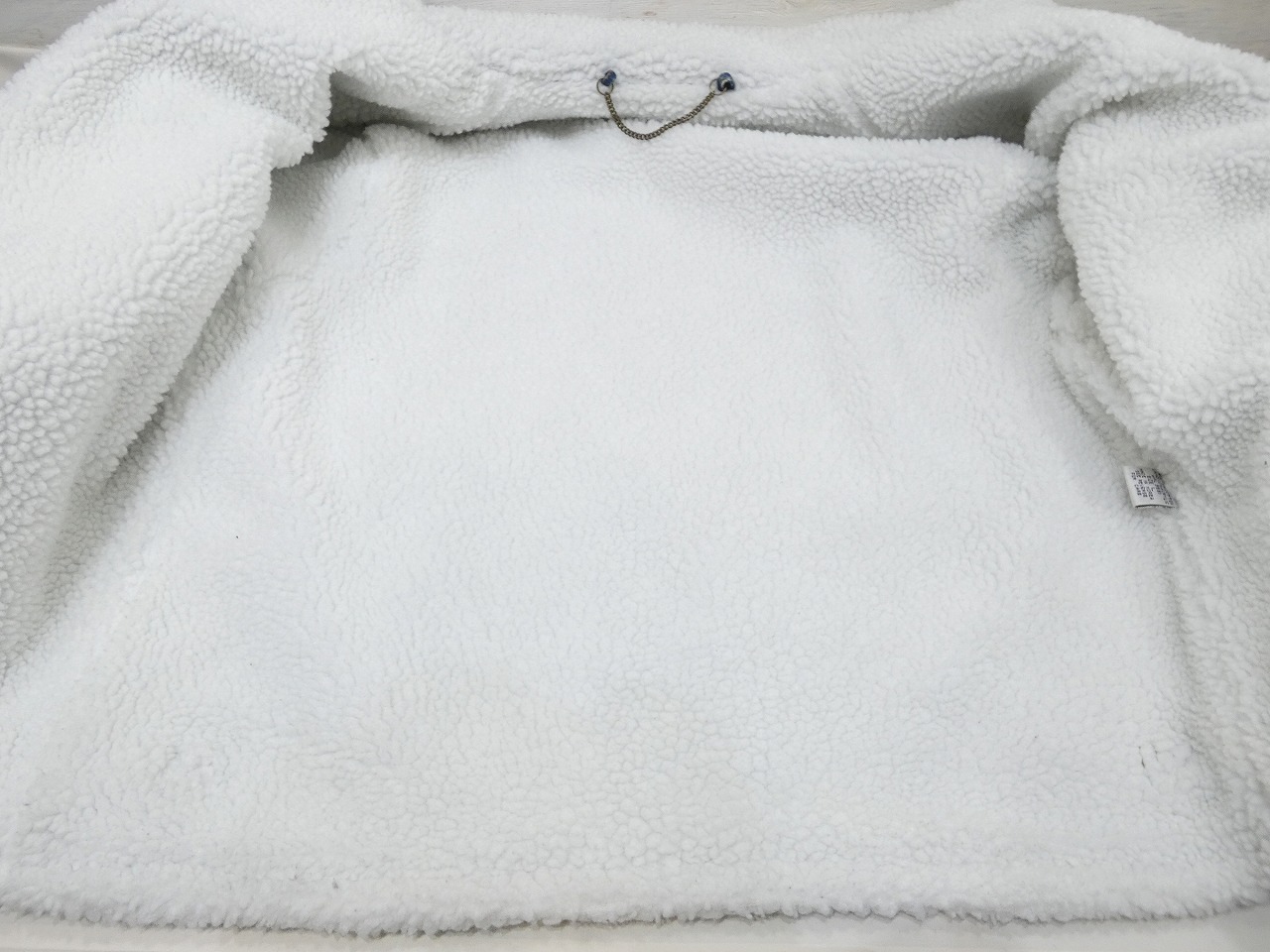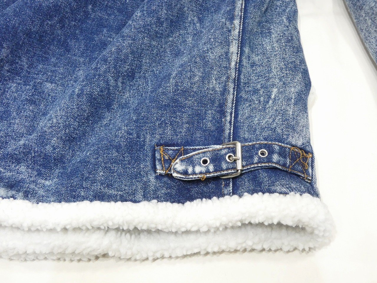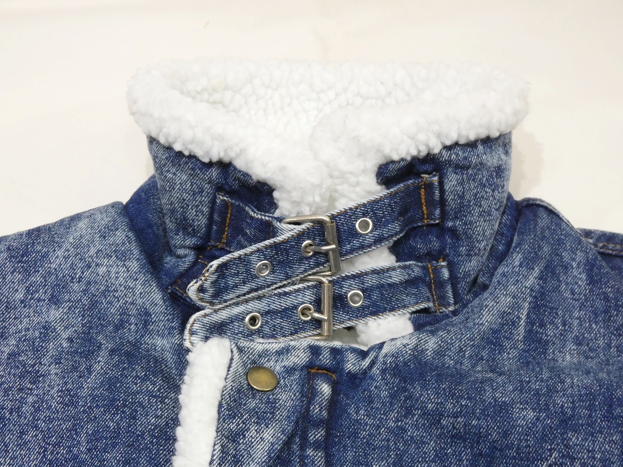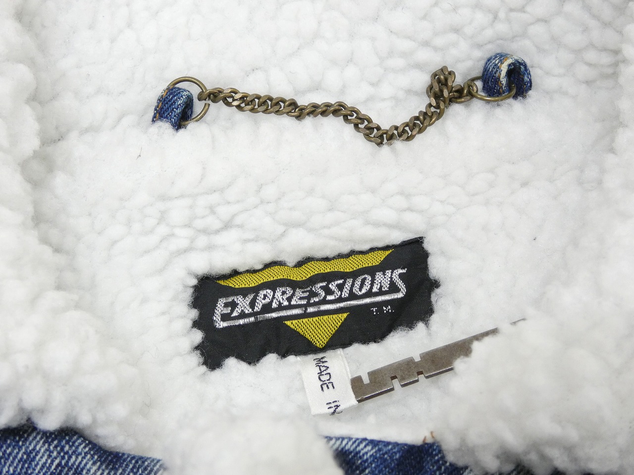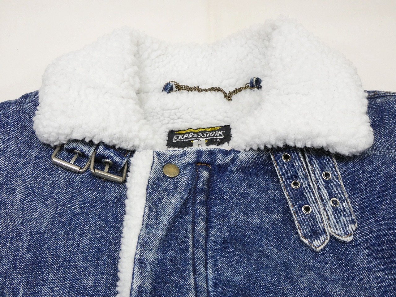 EXPRESSIONSは、この年代の物は特にユニークなデザインの物が多いブランドという印象です。そんなこちらは、アメリカ陸軍航空隊が採用したB-3 フライトジャケットをモチーフにしたデニムボアジャケットで、アシッドブルーデニム地にアクリルボアを全面に貼り付けた防寒性の高い1着です。襟はストラップが付いていてスタンドカラーにすると一層保温性が上がります。状態サイズ共に良いので、お探しだった方は是非、ご検討下さい。