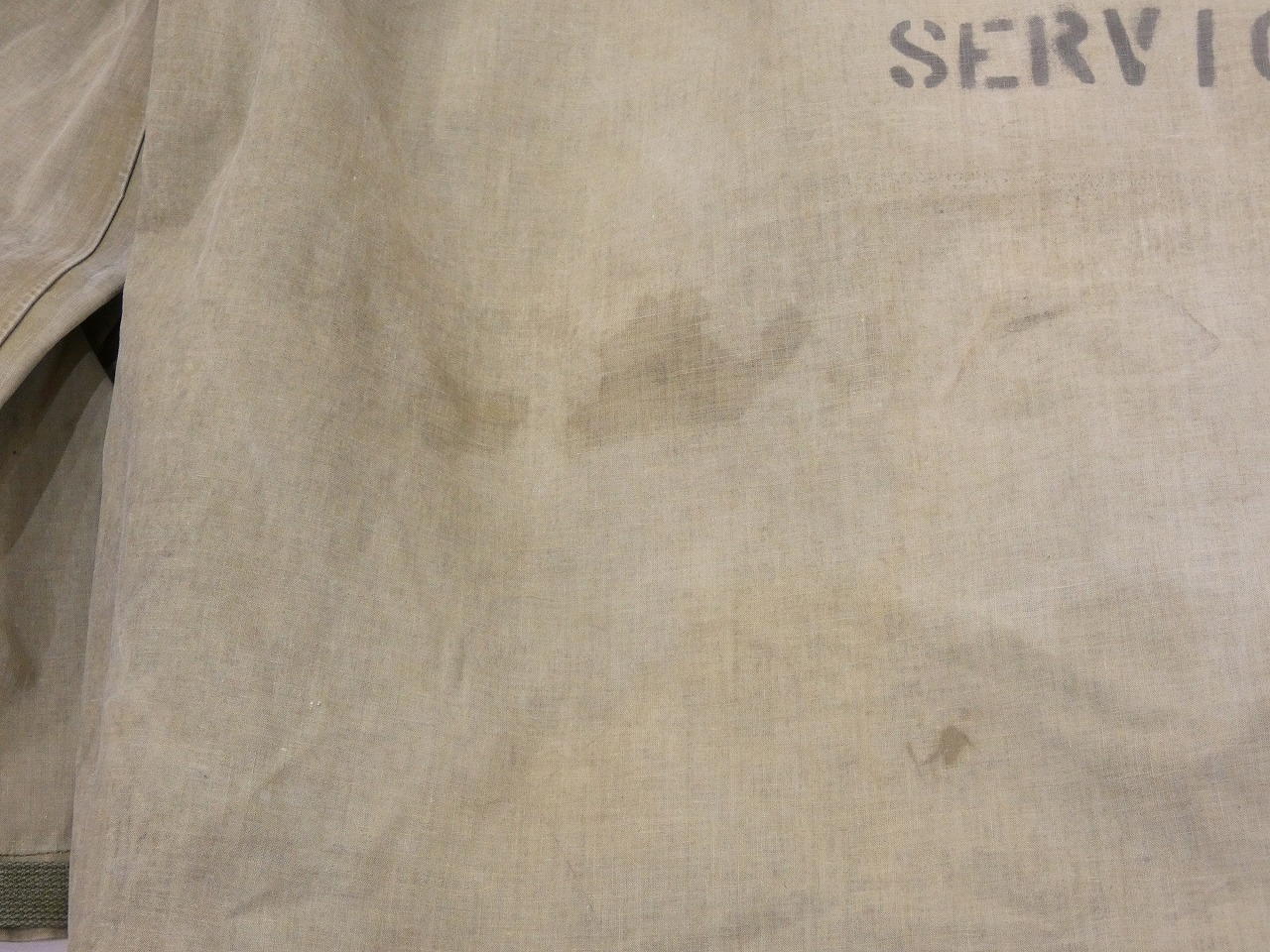 良くネット上ではUS NAVY(USN)のN-2レインパーカとして掲載されている物を多く見かけますが、こちらは実際はアメリカ陸軍用のウエットウエザーパーカになります。正式名称がUSNの方はJACKET RAIN PARKA N-2に対し、US ARMYはPARKA WET WEATHERになります。初期タイプは、フロントの4つのフックは留めは一緒ですが、袖先がスナップ留めに対しアジャスター留め、フードのドローコードハトメの位置も違います。タグもUSNは横長のNXsから始まるコントラクトに対し、US ARMYは縦長のタグで、製造年やコントラクター、Specification Noなどが入ります。こちらは残念ながらタグは読み取れませんが、以前デッドストックの物で確認しているので間違いありません。背中にはSERVICING BRANCHとステンシルも入っています。なかなかこのジャケットでステンシル入っている物は少ないです。フェードやヨゴレは見られますが、リアルさがあり雰囲気満点です。お探しだった方は是非、ご検討下さい。