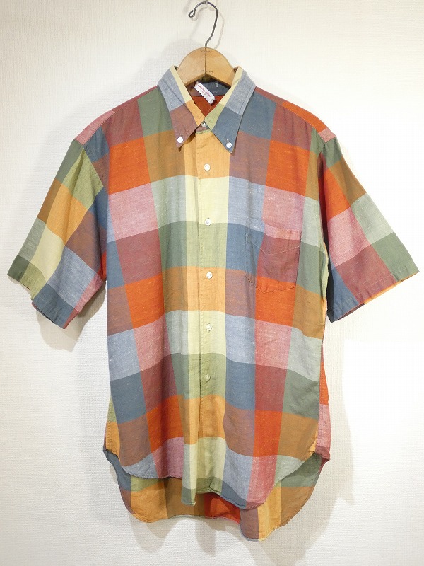 ブランドタグはありませんが、サイズタグの裏にRN 19672表記があり、カンパニーナンバーからOxford Industries Incの物だと分ります。襟にはHOMESPUN COTTONのタグもありますので、自社で生地を製造もしていることも分ります。Oxford Industries Incは1942年にOxford Mfg Coを買収した所からスタートしたメーカーで、現在ではTommy Bahamaを始めとする多くの有名高級メーカーを抱えています。一方では数多くのメーカーに商品を卸しており、78年から99年まではラルフローレンのシャツもOEMで生産しています。そんなこちらは、発色の良い大き目のブロックチェックのコットン生地で、コットンですがネップの飛んだリネンの様な良い生地感です。ポケットやフロントも綺麗に柄合わせされたおり高級感もあります。お好きな方も多いと思いますので是非、ご検討下さい。