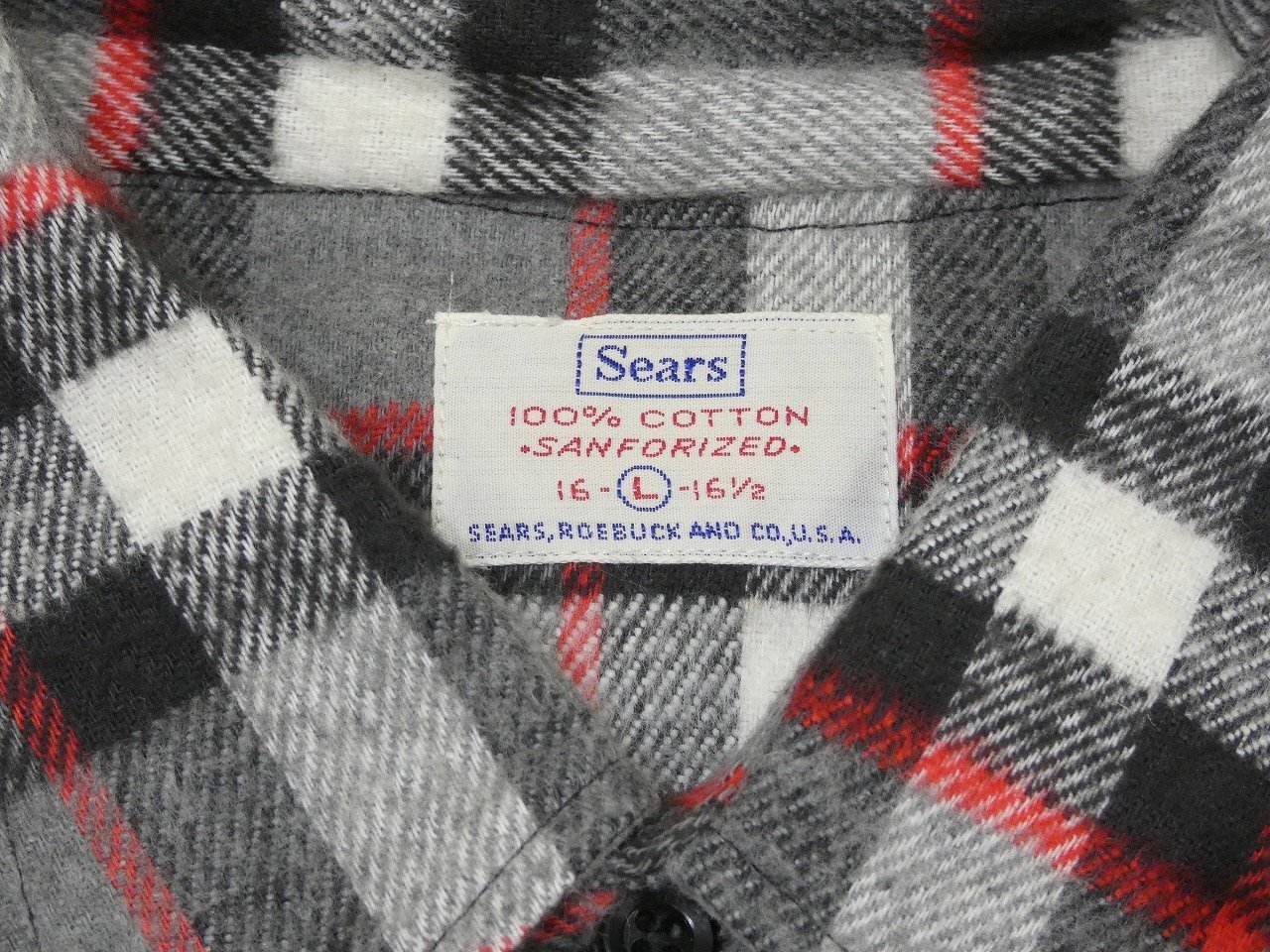 Searsは1892年創業の老舗メーカーで、3大ストアブランドの1つです。そんなこちらは、今最も注目度の高いアイテムの1つマチ付きヘビーネルになります。モノトーンベースにレッドのプレイドの入るクールなカラーリングで、ワークシャツらしいボタン付きのポケットに裾にはマチが付いています。更にLサイズでデッドストックと役がそろったシャツになります。お探しだった方は是非、ご検討下さい。