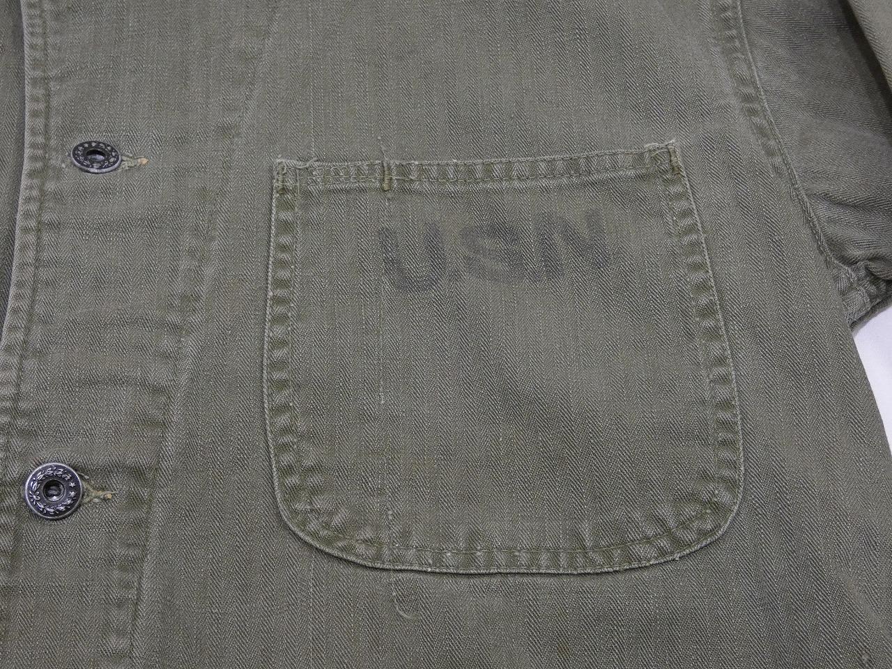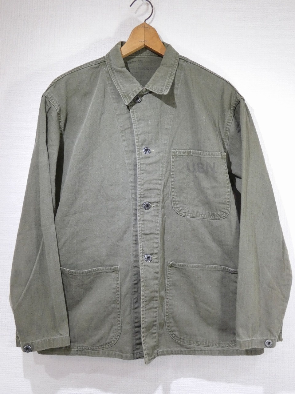 同年代のUSMC P-41同様に3つポケのシンプルなデザインで、生地はヘリンボーンツイル、胸にはU.S.N.のステンシル、ボタンは黒ラッカーの月桂樹ボタンになります。コントラクトNo'はNXSX-40678、コントラクターはIndustrial Garment Mfg Coで、製造年は1944年になります。昨今はルーズなファッションが流行っておりますが、カバーオールなどのビンテージワーク系ウェアは個人的にはジャストサイズが好みです。USMCのP-41よりも出てこ来ませんのでお探しだった方は是非、ご検討下さい。