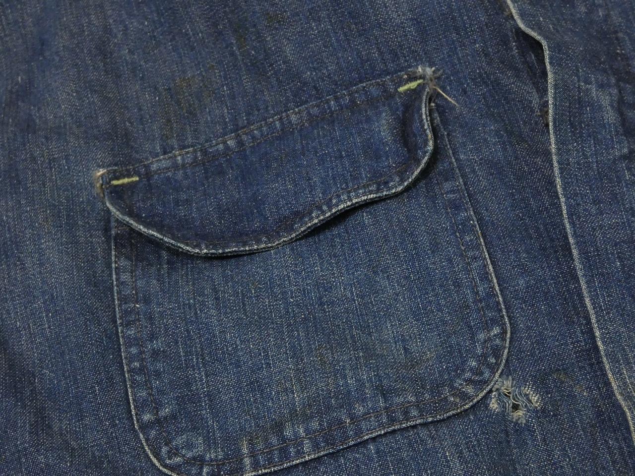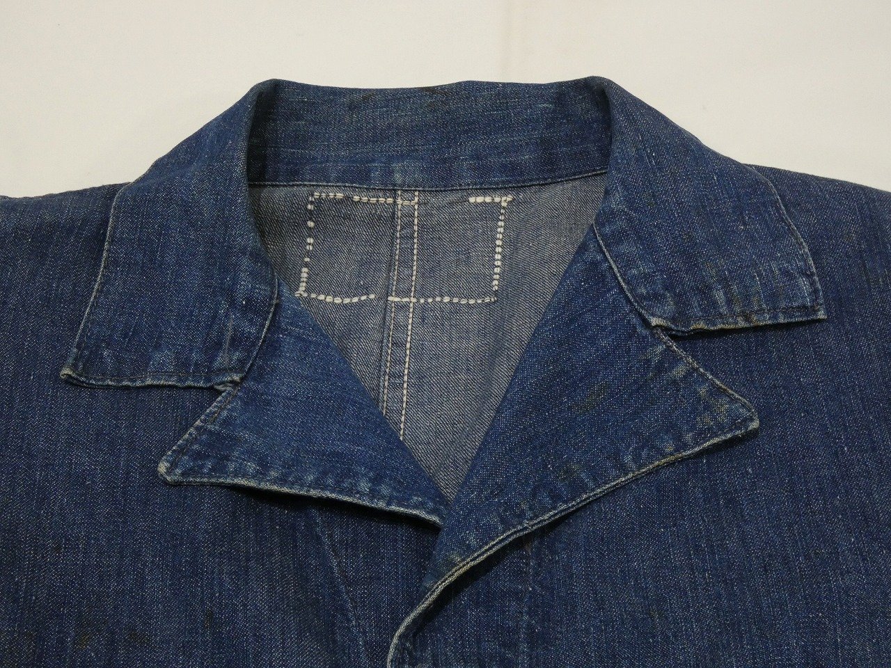 BLUE TOPは、メリーランド州で創業したFAWN GROVE MFG Coのプライベートブランドで、左胸にはプリントタグ、袖カフスボタンはブランド刻印入りになります。ジッパーはブラスのタロンが使われており、肩やサイドのステッチはグレーがかったブラック綿糸のダブルステッチになっています。このブランドの特徴でもあるグリーンの閂ステッチも良いアクセントになっています。古いインディゴの雰囲気が素晴らしく、オイルヨゴレやスレ落ち、ダメージなども見られますが、リアルワーククロージングのオーラを醸し出しています。オールインワンにも色々な素材の物がありますが、やはりデニム地の物をお探しの方が1番多いですが、1番見つからないと思います。お探しだった方は是非、ご検討下さい。古い年代の大き目デニムオールインワンは本当に出て来ません。