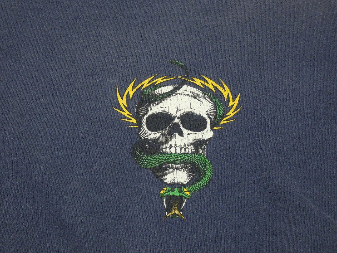 Powell Peraltaは1976年に誕生したスケートボードブランドで、その当時絶大的に人気を誇ったスケートチームBONES BRIGADEを結成ています。そんなこちらは、ボーンズブリゲードにも在籍していたMike McGillのシグネチャーモデルスカルスネークの1枚です。タグとバックのプリントには2005年のコピーライトが入っています。サンフェードによる色褪せは当時物の様な雰囲気を出しています。この年代の物でも既に20年以上経過しており、価格が上昇しています。大きいサイズは尚更です。お探しだった方は是非、ご検討下さい。