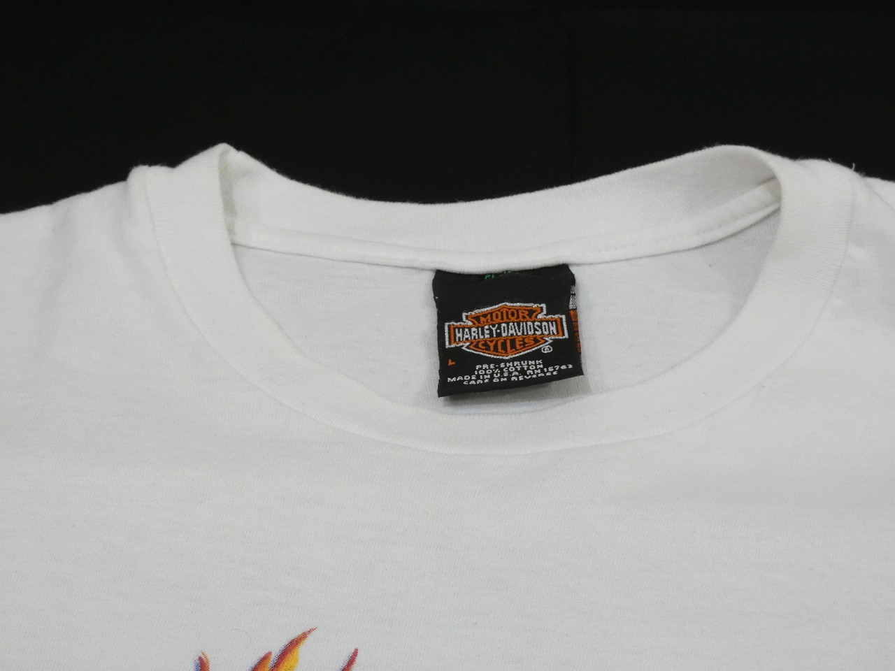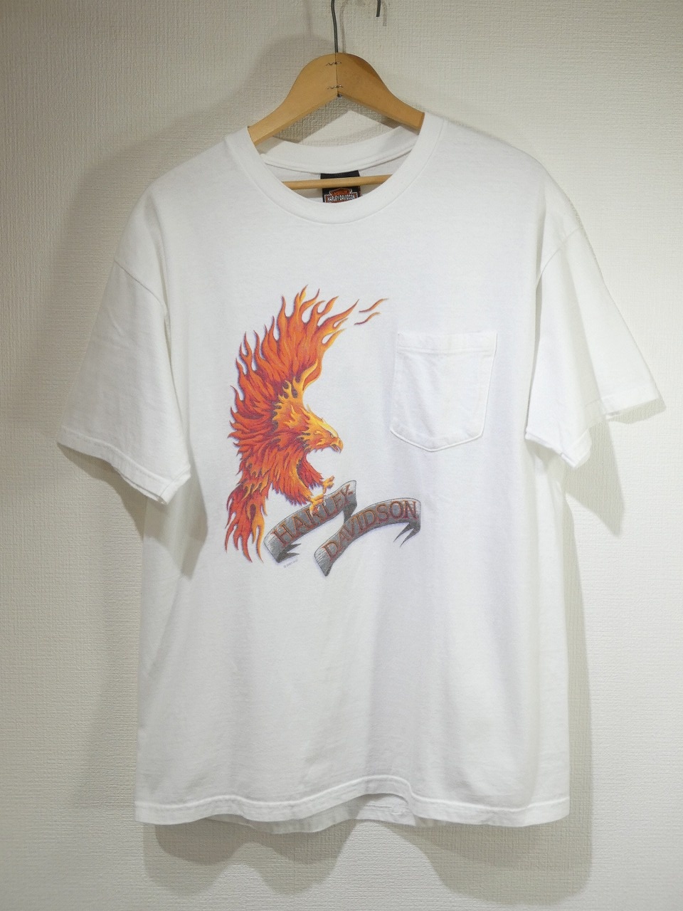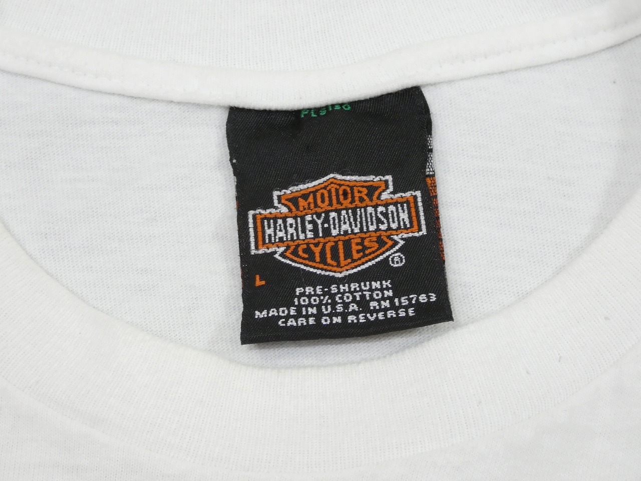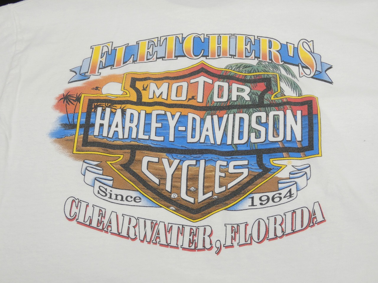 コピーライトは01年で、フロントにはフレイム イーグルとHARLEY DAVIDSONのグラフィック、左胸にはポケットも付いています。バックはフロリダ州にあったFLETCHER'Sというディラーショップ名とバー&シールドのロゴ、そしてフロリダらしいビーチの風景がプリントされています。因みにこのディーラーショップは2012年に閉店した様です。両A面のグッドプリント物で、しかもホワイトボディの物は探すと意外と少ないと思います。お探しだった方は是非、ご検討下さい。