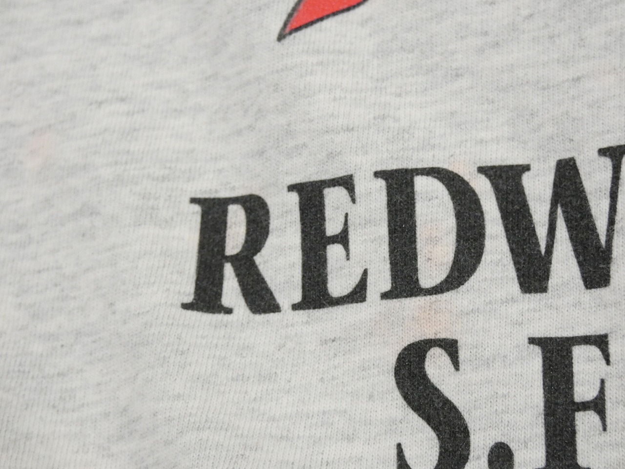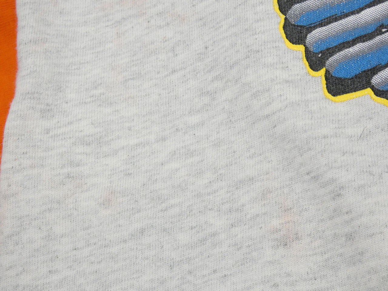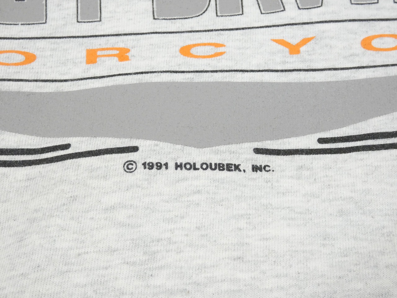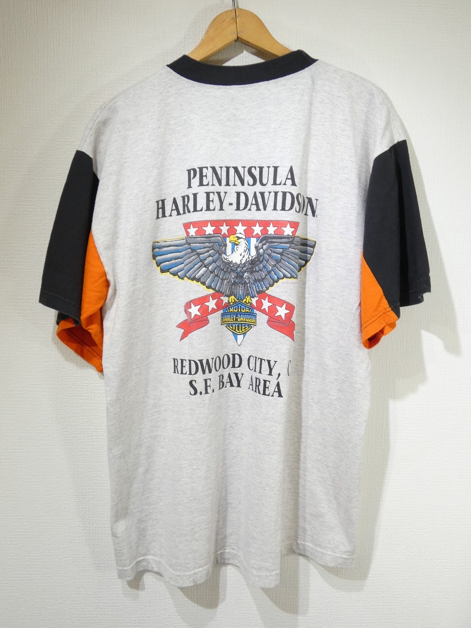 袖がハーレーカラーのツートン切替えになった珍しいボディーの1枚で、フロントにはHARLEY DAVIDSONのロゴグラフィック、バックには、カリフォルニア州にあったPENINSULA HARLEY DAVIDSONというディーラーの名と星条旗をモチーフにしたデザインに、大きなイーグルがバー&シールドロゴにつかまっているプリントが入ります。それぞれ91年と94年のコピーライトが入っています。珍しいボディーをつかったTシャツですので、お探しだった方は是非、ご検討下さい。