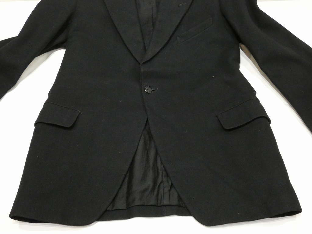 ブランドタグなどは無く、恐らくは仕立て屋等でビスポーク(オーダー)された物になると思います。ドレッシーなピークドラペルの1着で、綺麗な立体的なAライン、アーチ状の裾や極端に斜めに入った胸ポケット、サイドに回り込んだポケット等とても古さを感じます。作りもとても丁寧で生地も上質で厚みのある良いウール生地を使用しています。フロントボタンは2つのボタンがバー状で繋がっていて、僅かなサイズ調整やAラインシルエットを強調できます。サイズも日本人に良いサイズ感で、状態も素晴らしく、着用はもちろんコレクションやデザインソースにもお勧めです。お探しだった方は是非、ご検討下さい。