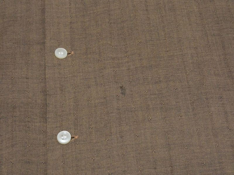 襟は襟芯を入れれる様になっていますが、襟芯は入っていないオープンカラーです。モカブラウンベースのレーヨン生地に、格子状の織り柄が入ります。何と言ってもこちらの魅力はその大きさで、古いレーヨンシャツの17 1/2-18と言うサイズは見たことがありません。カラーもデザイナー系や少しモードっぽく綺麗に着れる1枚かと思います。お探しだった方は是非、ご検討下さい。