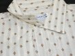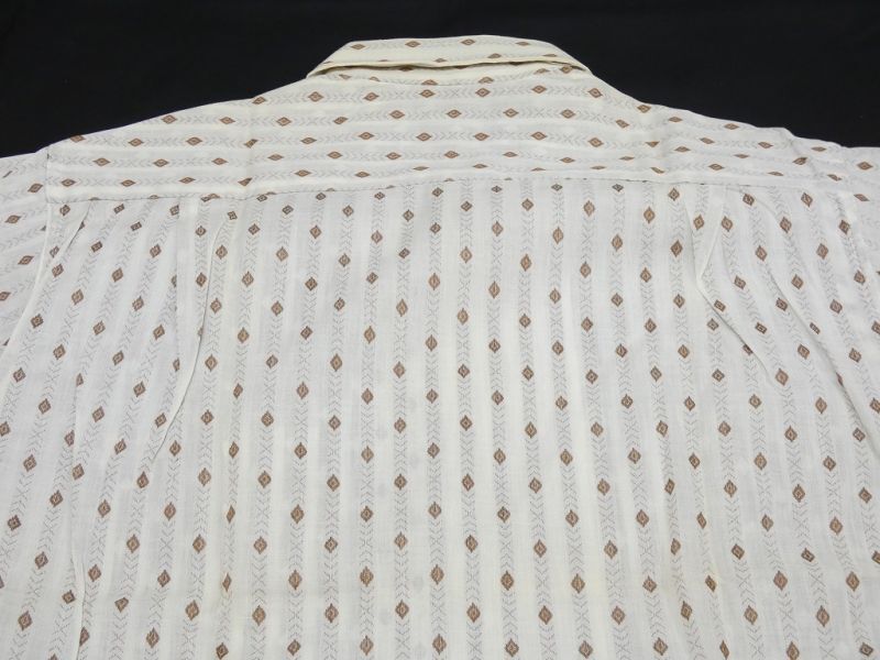 襟はステッチと襟芯の入ったオープンカラーで、胸ポケットは両胸に付きます。オフホワイトスベースの生地に、ブラウンのダイヤ織り柄がストライプ状に入ります。襟には当時のプライスタグも残っています。DEAD STOCK(NOS)の物は本当に見かけなくなってきました。お探しだった方は是非、ご検討下さい。