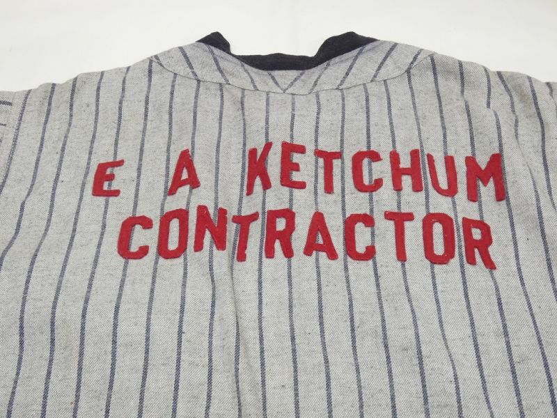 ブランドタグが無く詳細は不明ですが、この年代特有の台襟の付きの襟や長めのスリーブなど、要所要所に古いディテールが満載です。フロントにはM、バックにはE A KETCHUM CONTRACTORの赤いフェルトパッチも付きます。こちらもビンテージユニフォームらしく雰囲気良いです。パンツは6分丈位でこちらも古い年代の特長です。ヒップポケットは裾広がりのホームベース型になります。このポケットを見る限りでは20年代頃の物では無いかと推測します。古い年代のスポーツアイテムは、アメリカ本国でも昔からコレクターが存在しており、常に高値で取引されています。着用はもちろんコレクションにもお勧めです。なかなか上下セットで出てくる機会も少ないので、お探しだった方は是非、ご検討下さい。