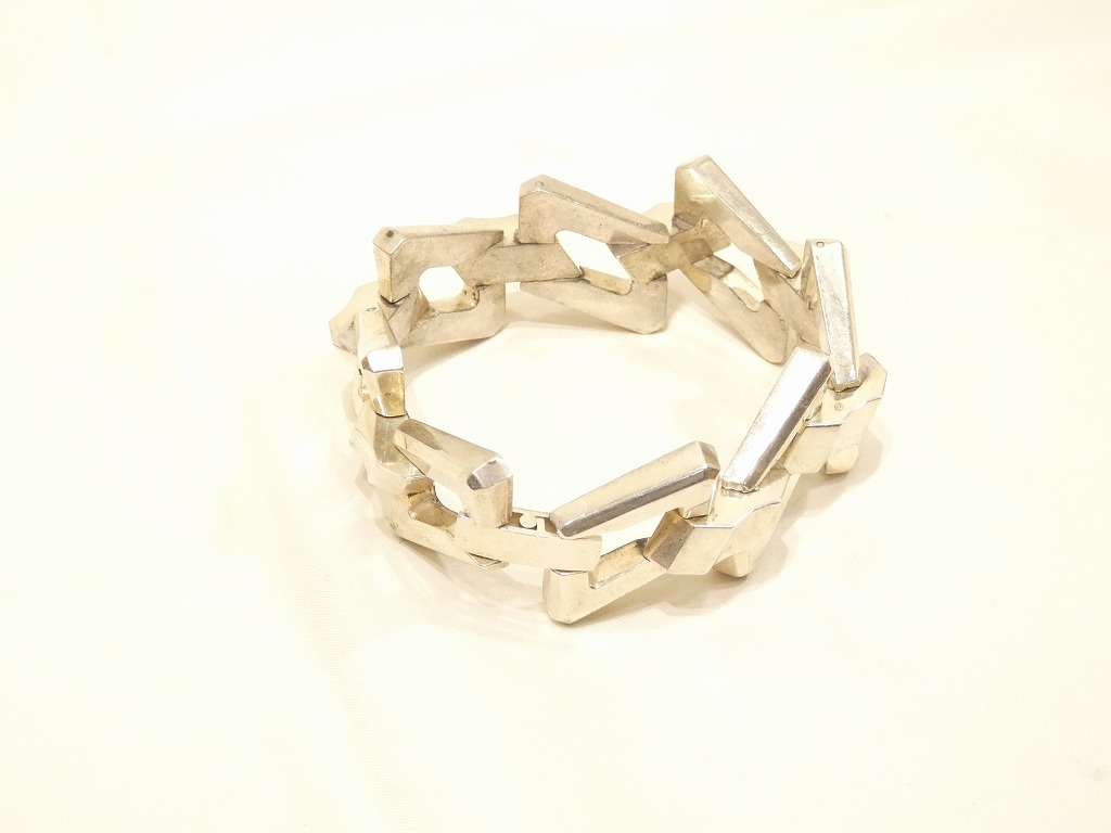ブランド刻印などは無く詳細は不明ですが、ヨーロッパでメジャーな835の刻印から、ユーロビンテージ物かと思います。デザインン的には60〜70年代頃のアメリカ物に似ているので、年代的にもその辺りの物かと思います。程よい重量感とジオメトリックなデザインが存在感がありとても良い雰囲気です。オールドシルバーブレスでもなかなかこの様な大胆なデザインの物は少ないので、お探しだった方は是非、ご検討下さい。