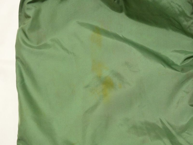 コンディションは、使用感はそれ程感じませんが、表面に薄シミが所々に見られ、裾リブにもダメージが見られます。