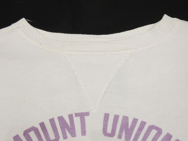 お探しの方も多いオールド スウェットで、前V、針抜き、染込みと役のそろった1枚になります。オハイオ州 アライアンスという田舎町にあるマウントユニオンカレッジ(現マウントユニオン大学)のバランスの良い染込みプリントも最高です。アメリカでのオールドスウェットの価格上昇は著しい物があります。こちらはコンディションがあまり良くないですが、海外ではこの様なアジのある物が逆にクールとされ、さらに人気を集めています。今後はさらに世界中で需要が増すと思いますので、お探しだった方は是非、ご検討下さい。