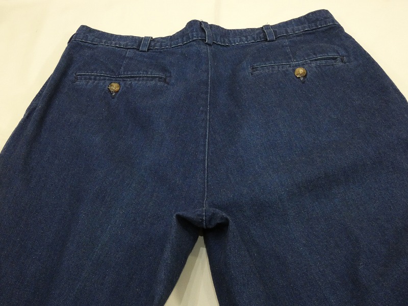 有りそうであまり見つからないデニム地のトラウザーズ(スラックス)で、2タックの少しテーパードしたシルエットは穿くととても綺麗なラインが出ます。タグにはWrinkle Freeと記載があり、シワになりにくい生地を使用しています。色もまだ十分に残っており、このまま綺麗に穿いても良さそうでし、ガシガシ穿いて色落ちを楽しんでも良さそうです。恐らく良い色落ちすると思います。サイズも34×31と良いサイズ感です。アメリカ製というのも希少性が高く嬉しいポイントかと。お探しだった方は是非、ご検討下さい。
