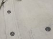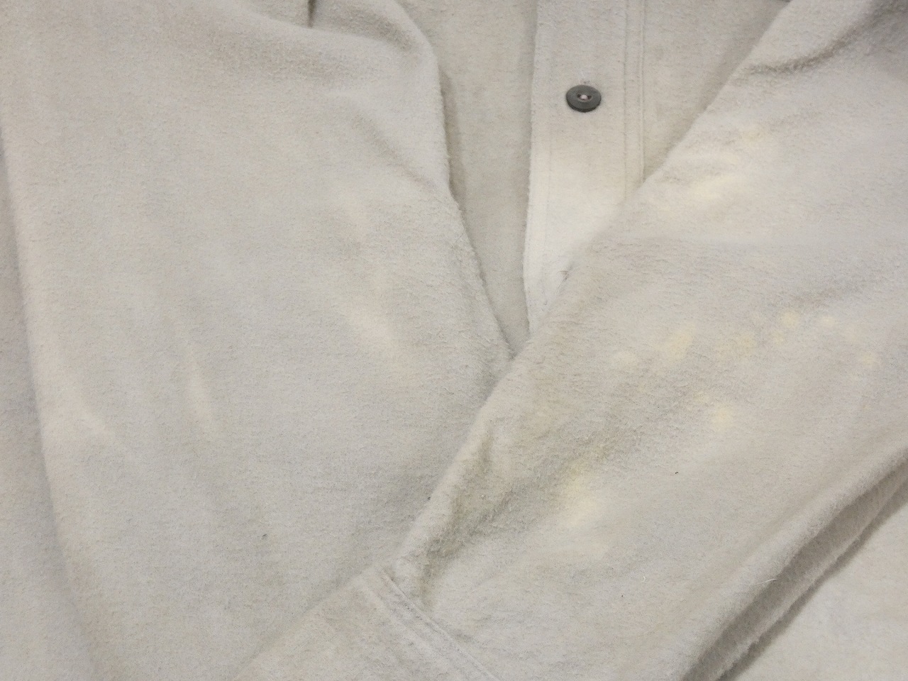 ブランド詳細は不明ですが、ウールやシャンブレーなどに比べ、圧倒的に出てこないチン付きコットンフランネルの1枚です。グレーベージュのコットンフランネル地に襟はダブルステッチでチンストラップが付き、袖はスクエアカフスで、裾にはマチが付き、後ろ身頃の方が少し短くカットされた古い仕様です。フェードと多少のヨゴレなどはありますが、ワークウェアとしてはとてもアジのある良い雰囲気の1枚だと思います。プルオーバーではなくフルボタンというのもポイントです。探されていた方は是非、ご検討下さい。