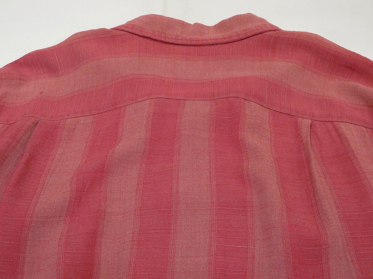 襟にはステッチと襟芯の入るオープンカラーで、ピンクレッド系のグラデーション (オンブレ) がとてもクールな1枚です。フロントとポケットは綺麗に柄合わせされていて、遠目ではグラデーションストライプの様ですが、よく見ると格子状の織り柄も入っています。アメリカ本国でもレーヨンシャツの高騰は著しく、買付けが難しくなっております。お探しだった方は是非、ご検討下さい。